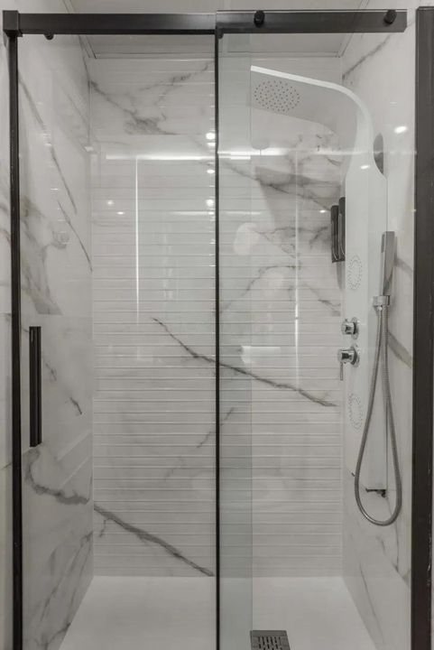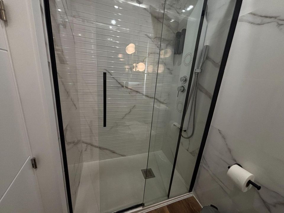 The fully renovated bathroom boasts luxury finishes and a spacious shower.