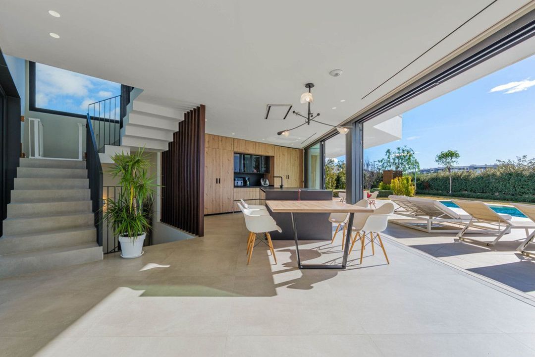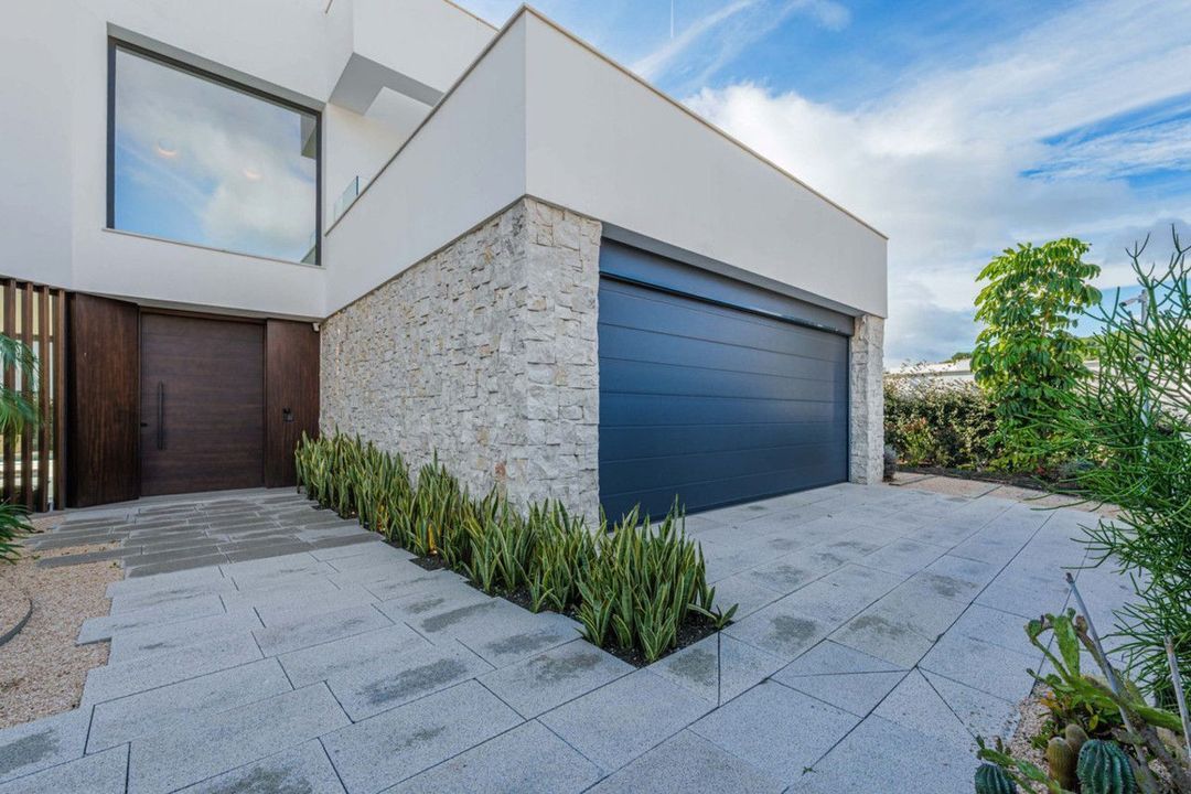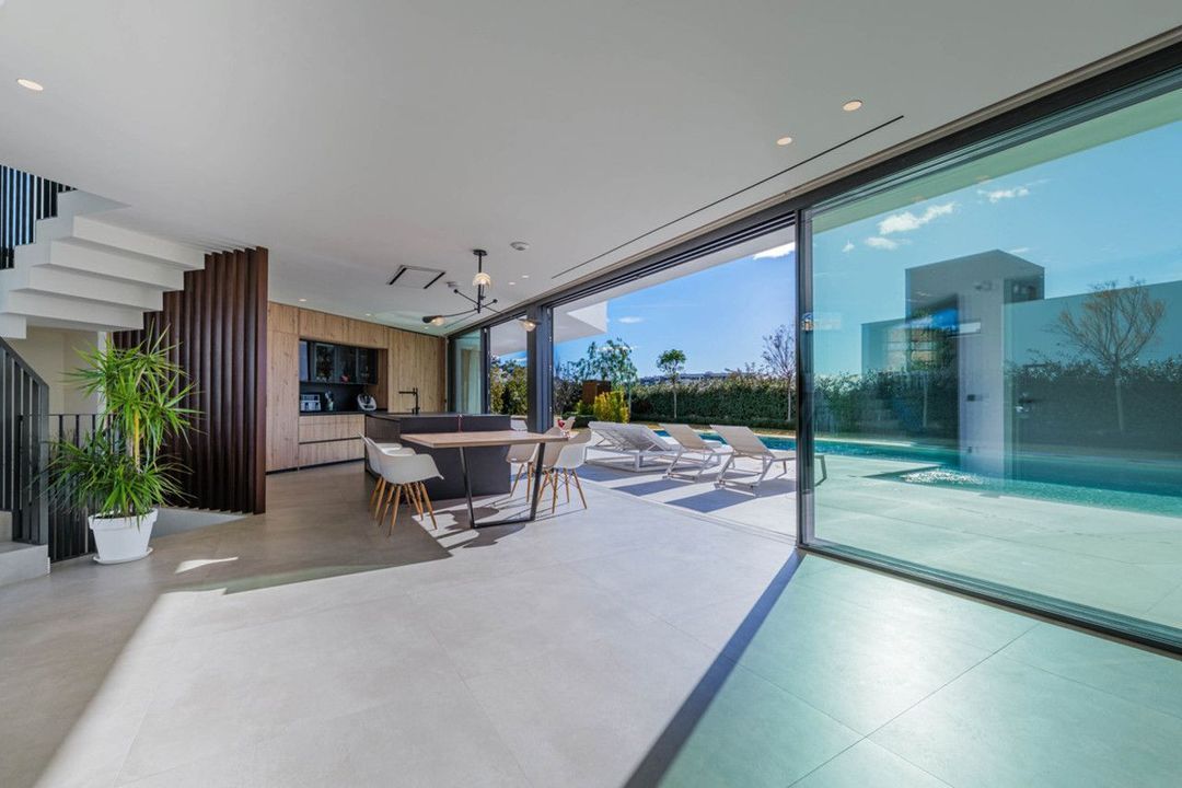 De woning is verdeeld over vier perfect geïntegreerde niveaus, die ruime en lichte gebieden combineren met een constante verbinding met de omgeving. De begane grond beschikt over een elegante open ruimte die de woonkamer, eethoek en design keuken met een centraal eiland integreert, aangevuld met grote ramen die visueel het huis uitbreiden. Dit niveau omvat ook de hal, een gastentoilet en een gesloten garage voor twee voertuigen. De villa beschikt ook over een eigen zwembad en een tuin met automatische irrigatie. Het zwembad, omgeven door een grote overdekte veranda en een verhard solarium, creëert de perfecte setting voor ontspanning en buitenbijeenkomsten.