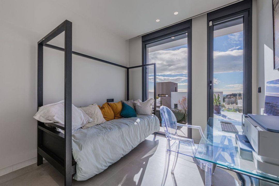 Het slaapgedeelte, gelegen op de bovenste verdieping, heeft drie ruime slaapkamers. De master suite beschikt over een inloopkast en een eigen badkamer, terwijl de andere twee slaapkamers een volledige badkamer delen. Alle kamers hebben directe toegang tot royale terrassen, ideaal om te genieten van het uitzicht en zonsondergangen. Op het dak kroont een spectaculair solarium het pand met een panoramisch uitzicht op de omgeving en de zee. De kelder biedt een multifunctionele ruimte met meerdere mogelijkheden, zoals een fitnessruimte, bioscoopruimte of opslagruimte, evenals een ruimte voor nutsbedrijven.