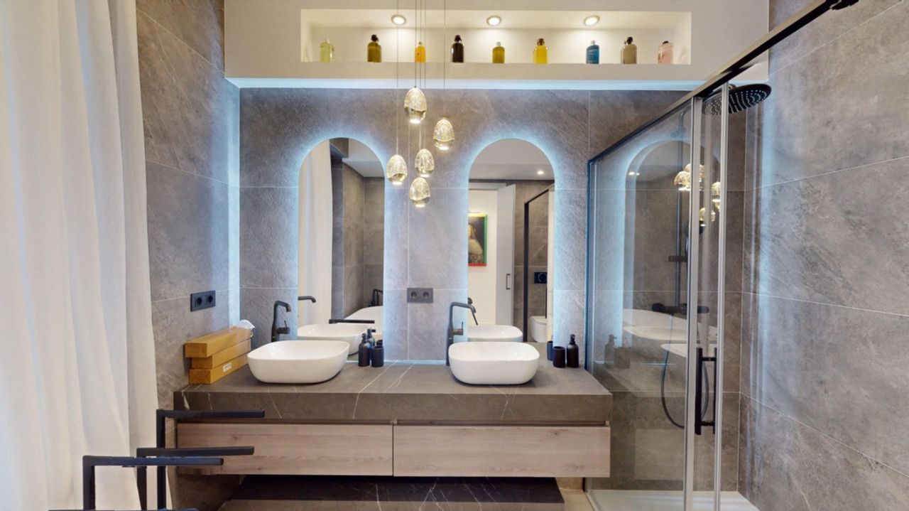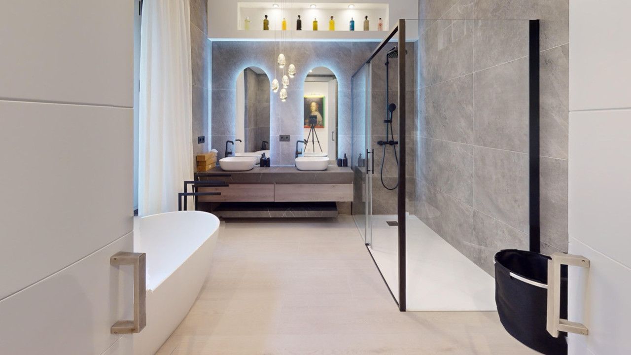 The high-end kitchen features an invisible hob integrated into the countertop, while the expansive open-plan living, dining, and kitchen area boasts a striking "cathedral" ceiling. An artistically designed, illuminated corridor connects two of the bedrooms and bathrooms, leading to the master suite with its own ensuite and dressing area. All bathrooms benefit from natural light.