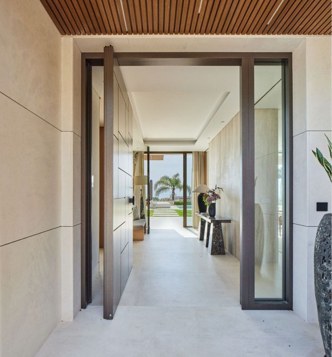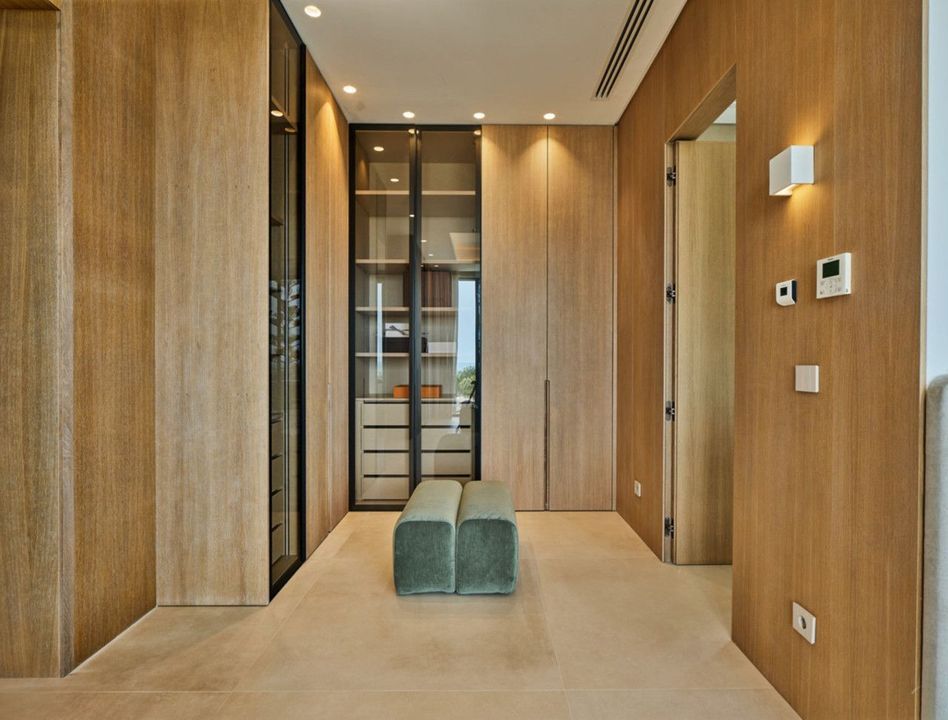 The first floor hosts three further bedrooms, all designed to offer a sense of openness and tranquility, each with access to a terrace that captures the essence of coastal living. The basement level is thoughtfully designed as a retreat, featuring a fully equipped gym, sauna, cinema, and an additional bedroom—ideal for guests or flexible use as needed.