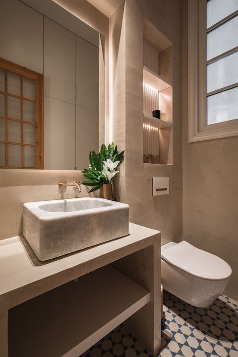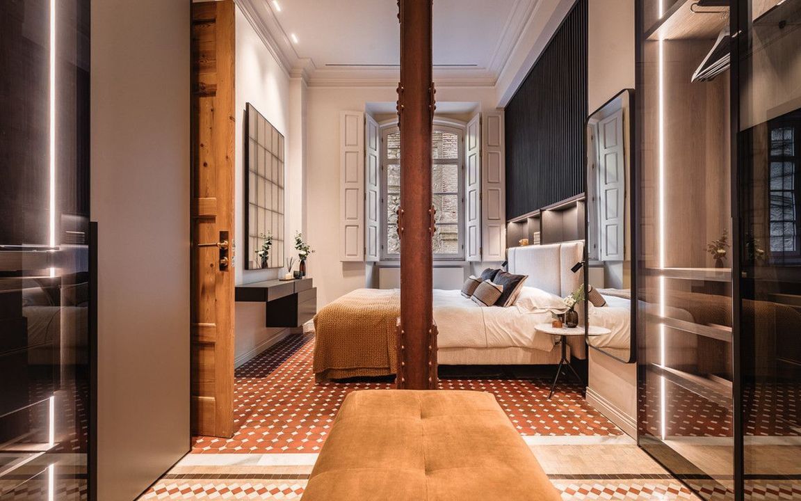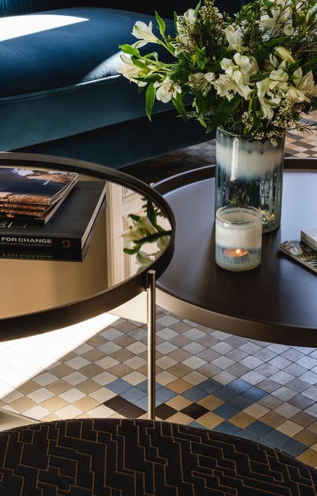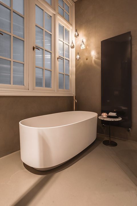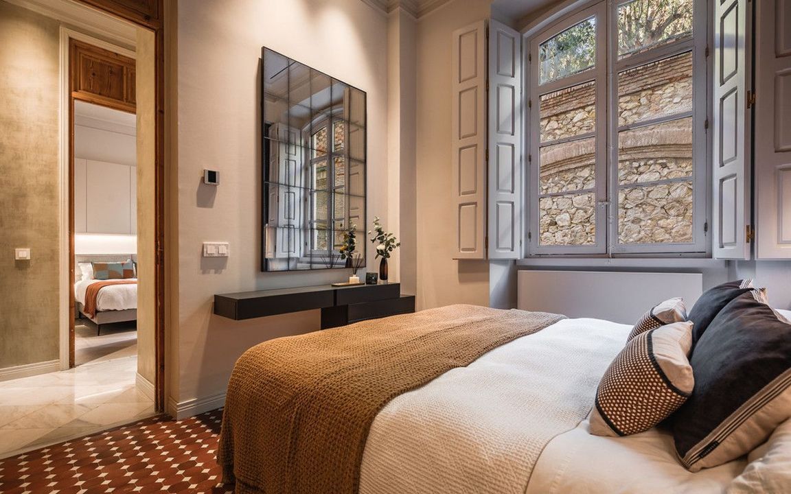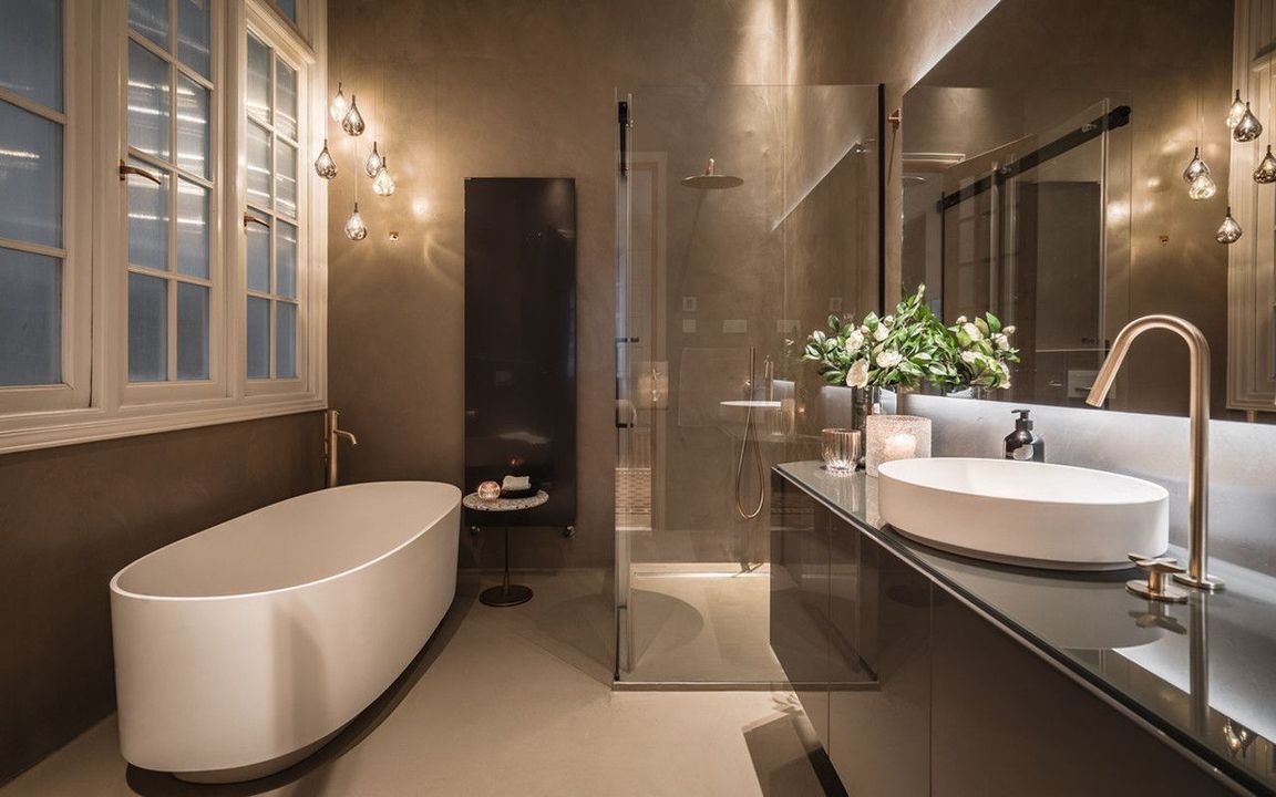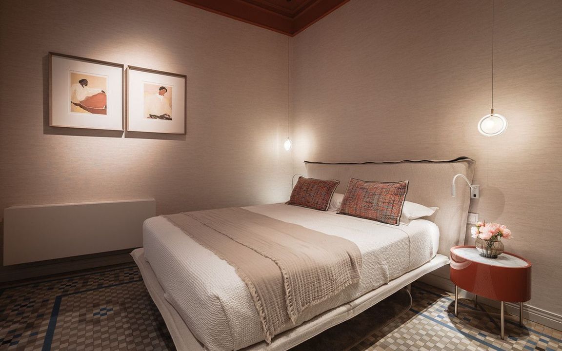 De badkamers zijn voorzien van stukken van Villeroy & Boch en geborstelde gouden fittingen van Toro Bath, naast sobere meubels van Inbani. De verlichting, ontworpen door Eflux, verbetert discreet de architectuur, terwijl meubels van Pianca, stoffen van Casamance, en handgeblazen glas armaturen van Bomma een setting die geschiedenis, design en comfort combineert met balans en natuurlijkheid.
