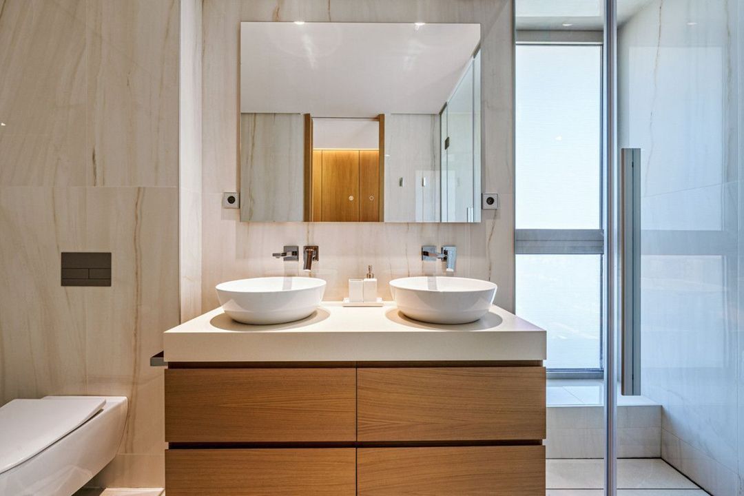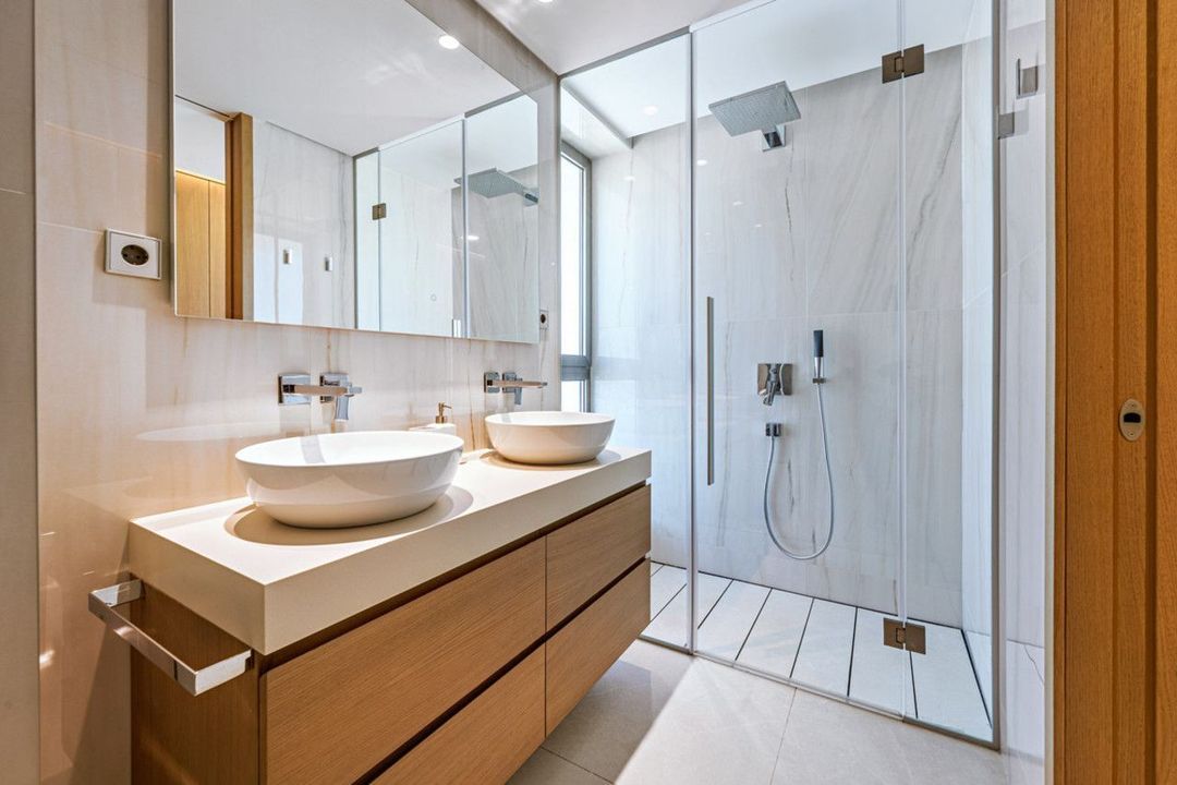 De hoofdslaapkamer heeft een eigen badkamer en een eigen toegang tot het terras, terwijl de tweede slaapkamer gunstig gelegen is naast de tweede badkamer. Beide badkamers zijn ontworpen met hoge kwaliteit afwerkingen, een met een bad en de andere met een inloopdouche, biedt zowel comfort als praktischheid.