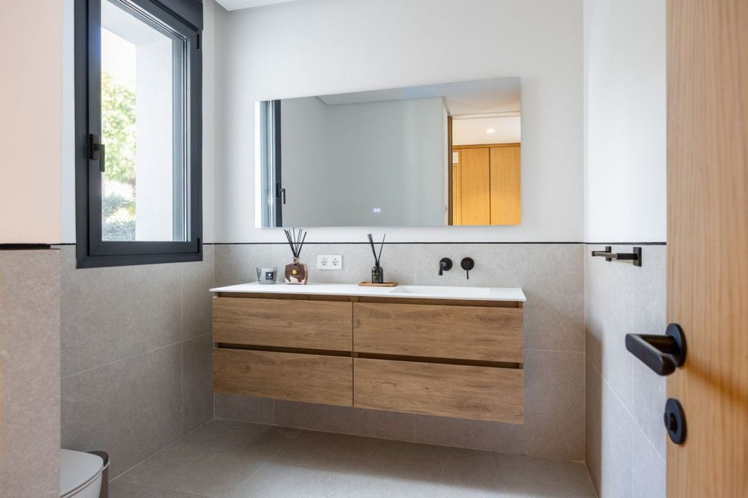 Occupying an elevated position, the villa enjoys breathtaking, uninterrupted panoramic views of the sea from every level, while its southern orientation ensures abundant natural light throughout the day. The property offers four expansive en-suite bedrooms and seven designer bathrooms, each guest suite enjoying complete privacy and luxurious finishes. Comfort is paramount, with water-based underfloor heating throughout, complemented by an advanced Airzone climate system and full smart home integration.