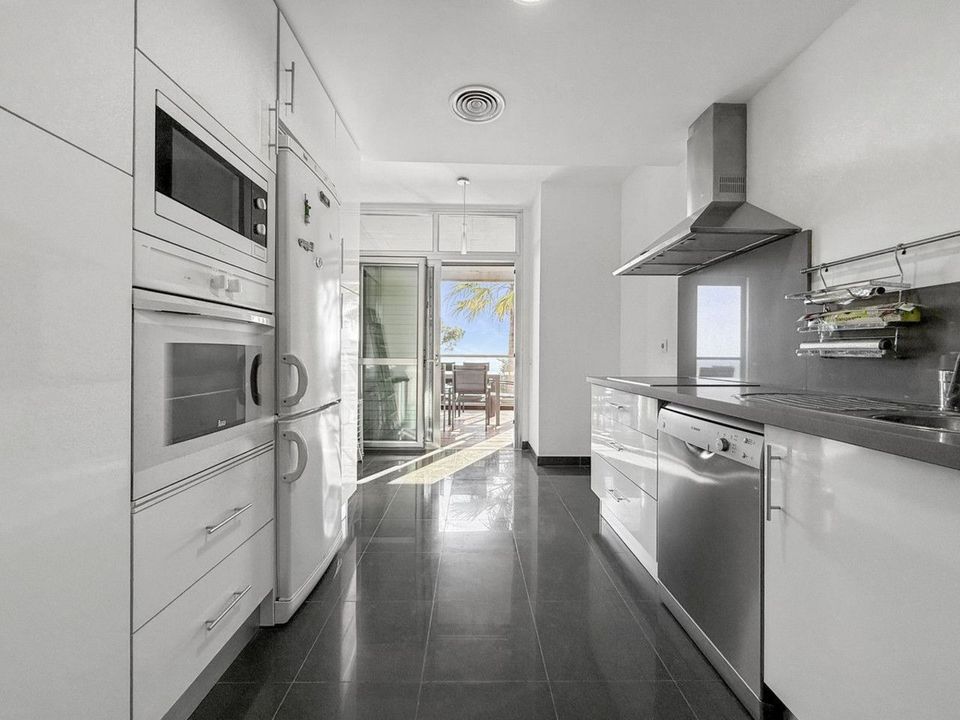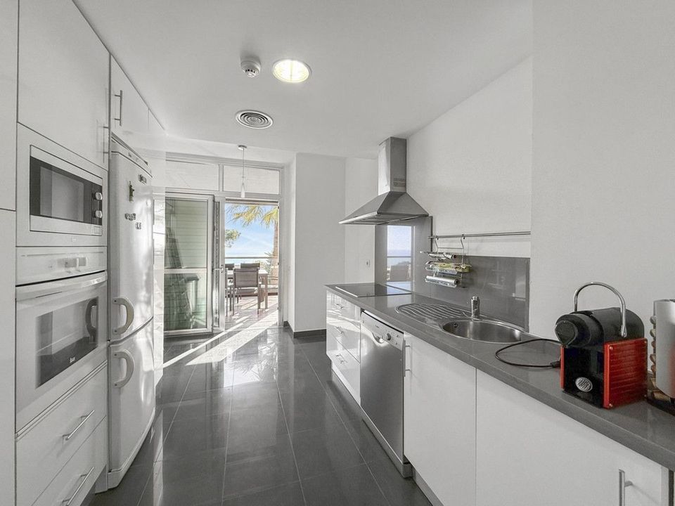 The property welcomes you with an entrance hall featuring built-in wardrobes, leading into a spacious and bright living-dining area. This space opens onto a spectacular private covered terrace with premium teak wood finishes, where breathtaking panoramic sea views can be enjoyed.