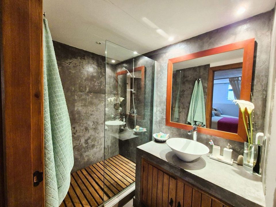 The master suite occupies the entire upper floor, offering ultimate privacy. It features a charming dressing area with high vaulted ceilings and exposed wooden beams, adding warmth and character to the space. An en-suite bathroom and stunning sea views complete this peaceful and private retreat.