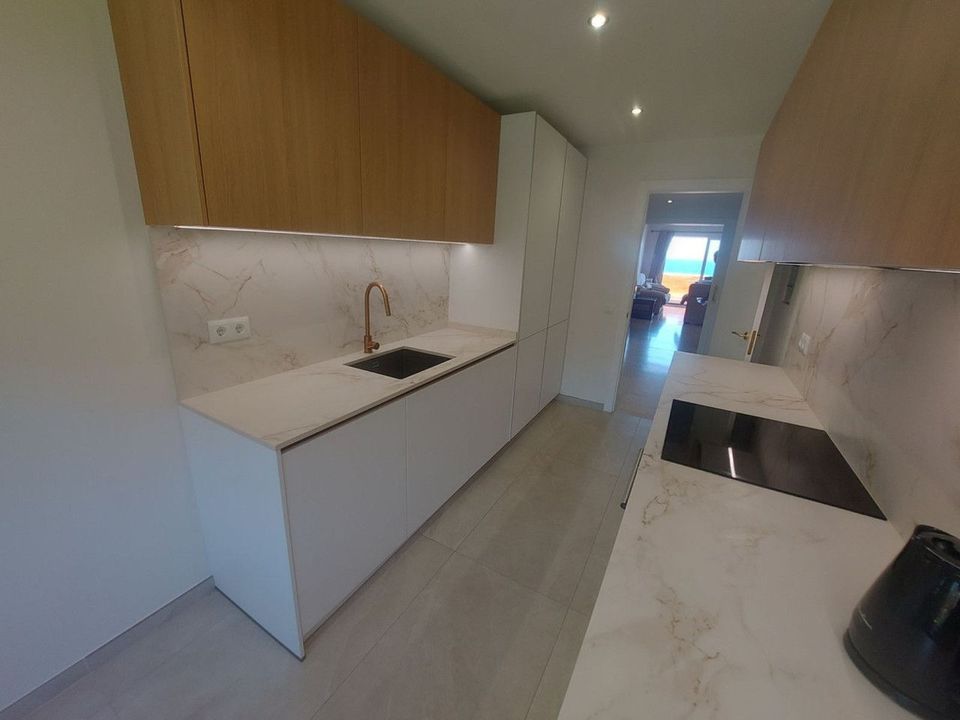Urb. Los Granados - Sought after front line Beach development. A well presented modernised (new top of the range kitchen) front line beach 2 bedroom corner apartment with uninterrupted beach and sea views from the terrace. The complex is located on the beachfront with a large lagoon style swimming pool set in spacious grounds. The complex also has underground parking, 24hr security and is a short walk along the beach to the fishing village of Castillo and Duquesa marina.