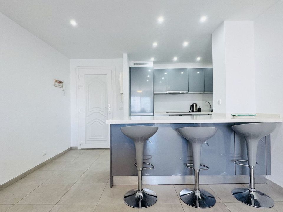 The property offers two generous double bedrooms, including a master bedroom with fitted wardrobes and breathtaking sea and marina views. There is individual air conditioning in every room of the apartment, ensuring all year-round comfort. A large contemporary bathroom features a walk-in shower.