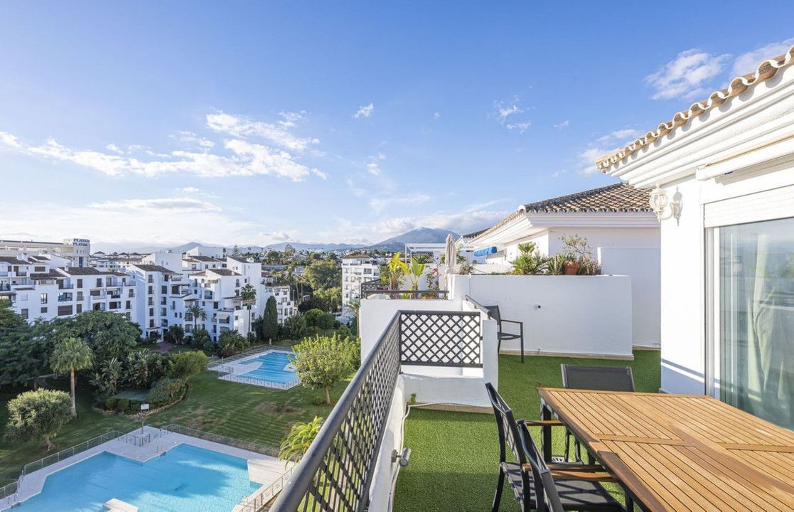 Welcome to Marbella.Imagine waking up every morning with the gentle Mediterranean breeze caressing your face and the promise of a new day in one of the most exclusive enclaves in the world.This luxurious duplex, located in the vibrant heart of Puerto Banús, is not just a property: it is a haven of elegance, serenity and style.From the moment you step inside, you will be dazzled by the exquisite décor, where every detail has been carefully chosen to create a unique visual and sensory experience.The spacious and bright rooms open naturally to the outside, allowing the southern light to flood every corner.On the main floor, the fully equipped separate kitchen is an ideal space for both enjoying fine dining and sharing special moments.Adjacent to it, the living room offers an atmosphere of absolute comfort, perfect for relaxing after a day enjoying the charms of Marbella.On this same level, two bedrooms guarantee rest and privacy:• A master suite with a king-size bed, private bathroom and a cosy glazed balcony where silence and calm reign supreme.• A second bedroom with two single beds and a full bathroom, designed for the comfort of family or guests.Climbing the elegant staircase, you discover the true treasure of the property:a spacious master suite with direct access to the upper terrace.From there, the sea views are a changing spectacle that accompanies every sunrise and every sunset.