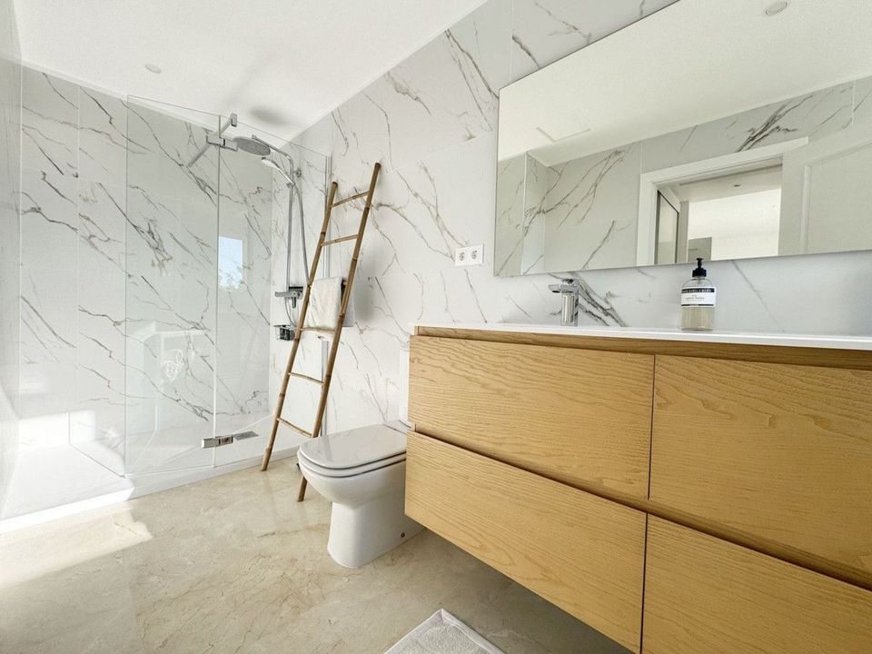 Er is een slaapkamer met en-suite badkamer en toegang tot het terras op de begane grond. Boven hebben we de 2e slaapkamer met en-suite badkamer en een voor- en achterterras,