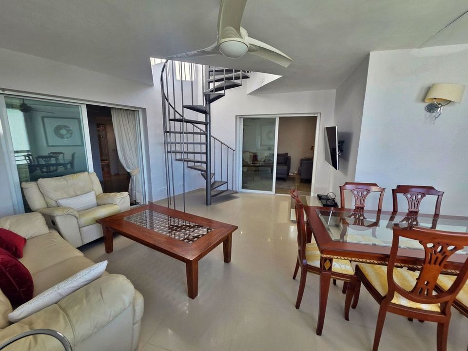 The apartment is distributed over two levels. On the main floor there are two bedrooms and two bathrooms, as well as a terrace that has been enclosed and is currently used as a separate dining area next to the living room.