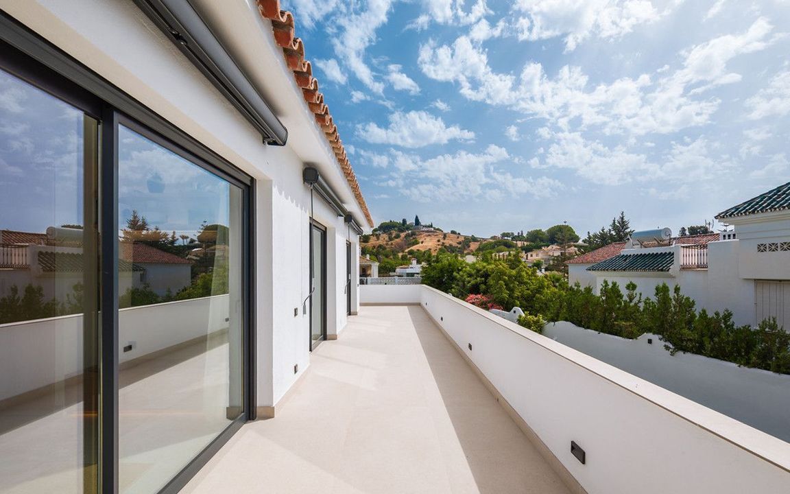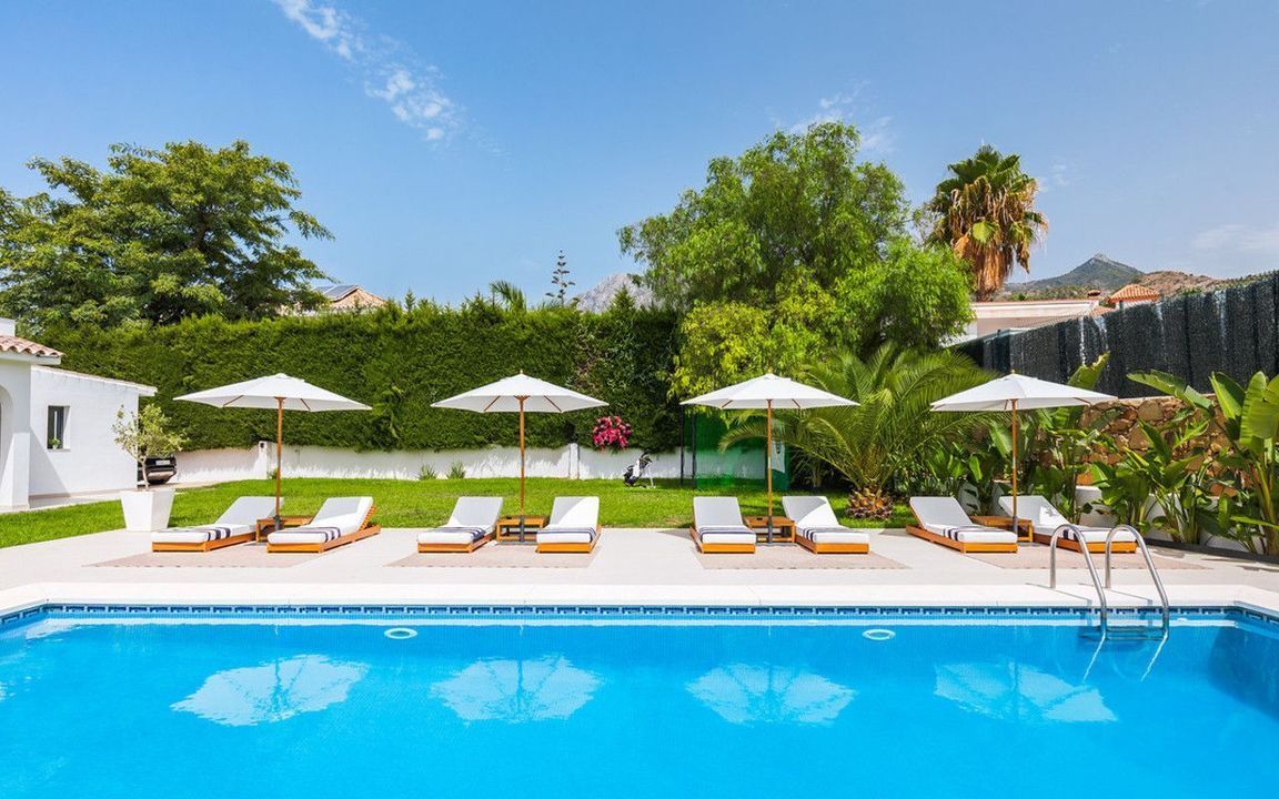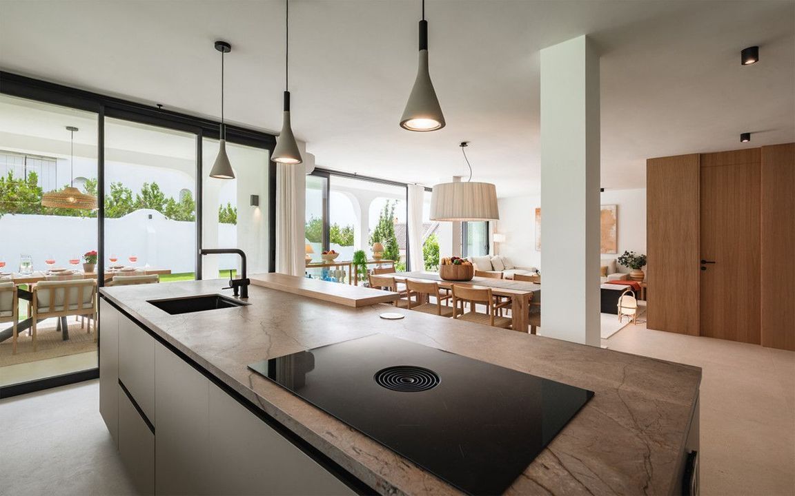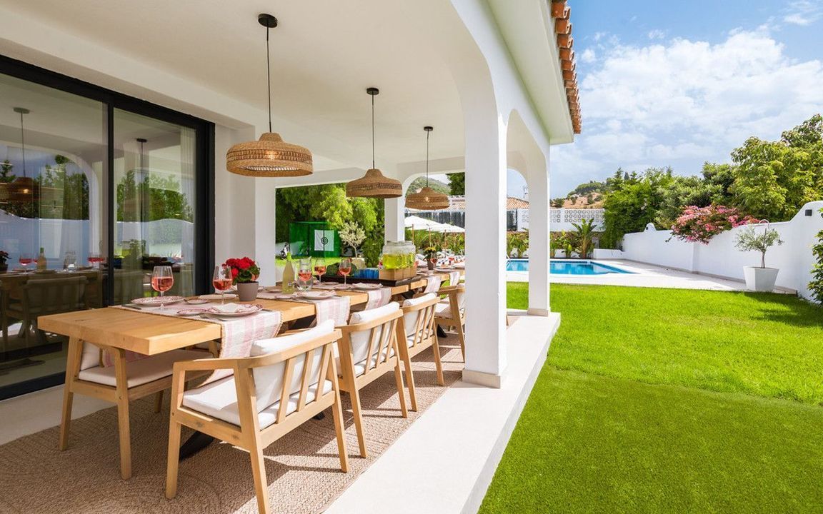 Exclusieve villa met modern design en subtiele Andalusische accenten, gelegen op een ruim en privé vlak perceel in Huerta del Prado, op slechts 5 minuten rijden van het strand, het winkelcentrum La Cañada en de Golden Mile van Marbella.