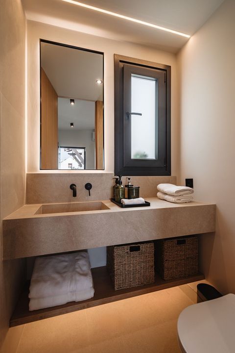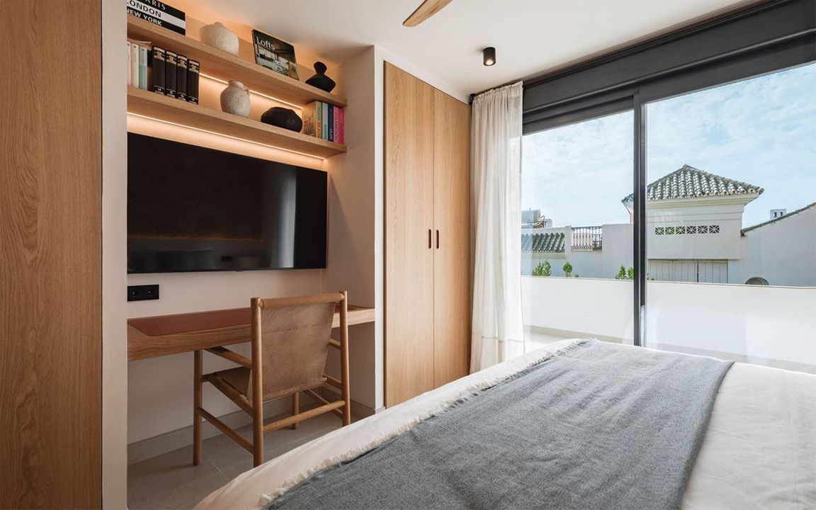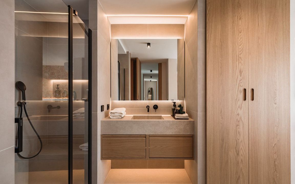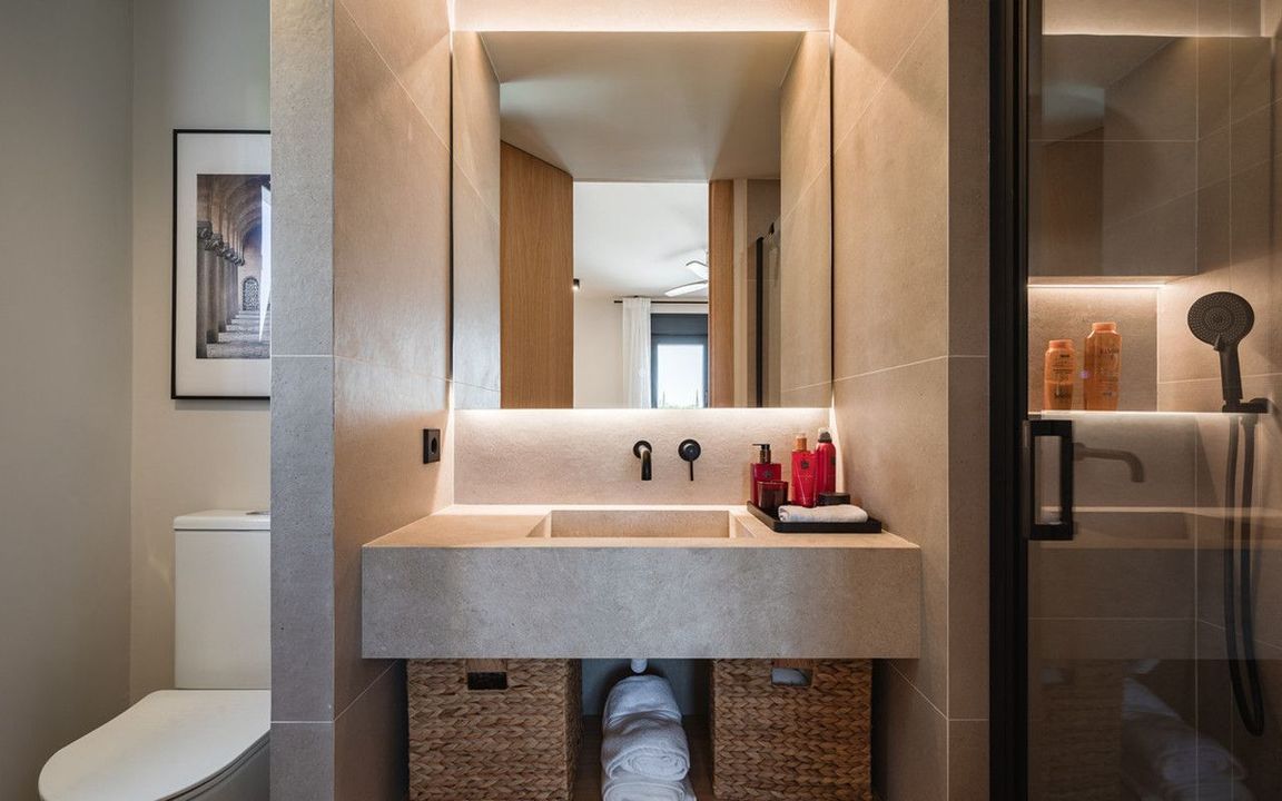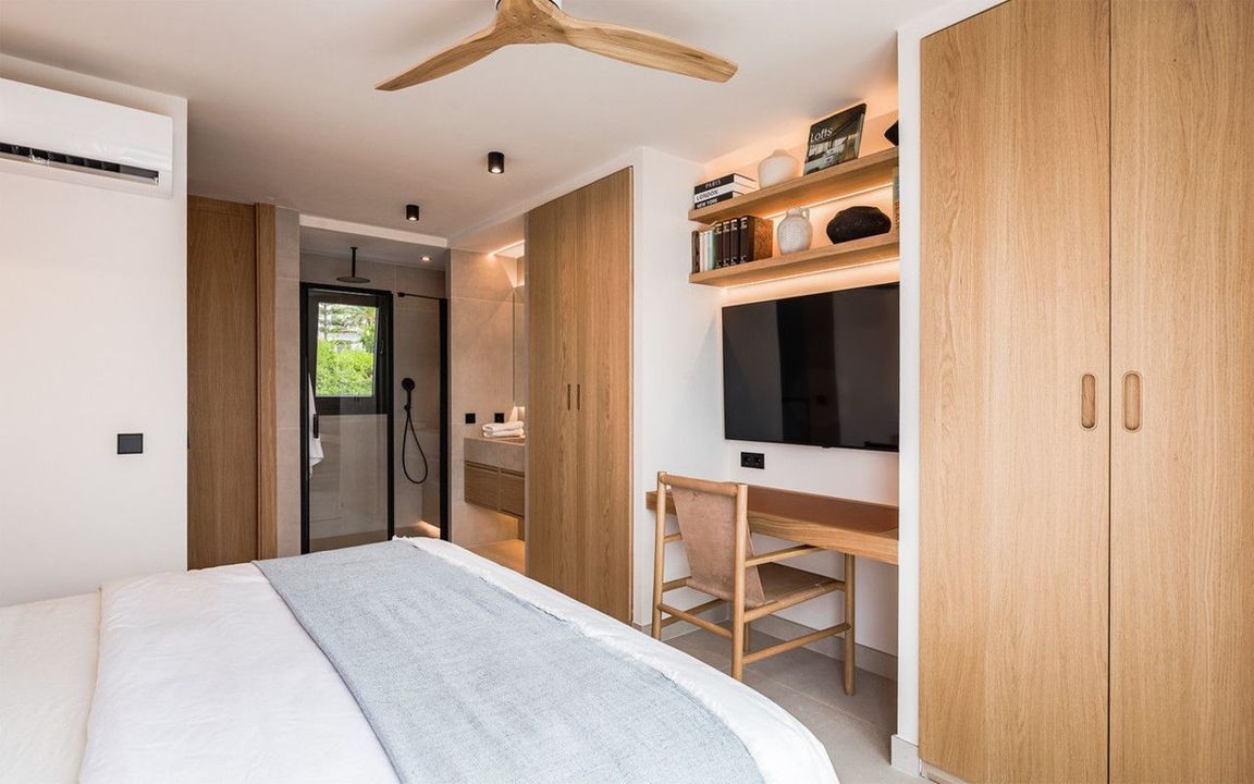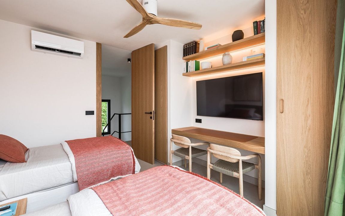 De villa biedt zes tweepersoonsslaapkamers, vijf badkamers, waarvan vier en-suite, en twee gastentoiletten; drie van de slaapkamers hebben directe toegang tot een terras met uitzicht op de bergen en de natuurlijke omgeving. Er is parkeergelegenheid voor twee auto's en een laadstation voor elektrische voertuigen.