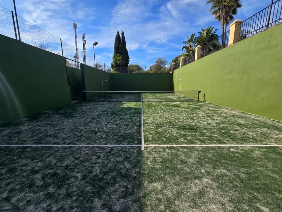 Deze Semi-Villa met drie slaapkamers + bonuskamer en een zelfstandige suite ligt in een kleine gemeenschap met een uitgestrekt terrein en beschikt over een zwembad van dubbele lengte, een paddlebaan en prachtig uitzicht op zowel de zee in het zuiden als de La Concha berg in het noorden. Binnen vind je marmeren vloeren, centrale airconditioning en verwarming, een hoge bar en een terras dat perfect is om gasten te ontvangen.