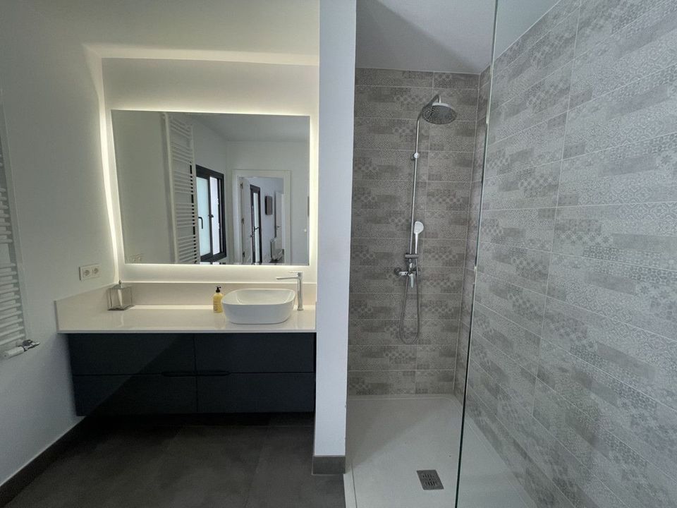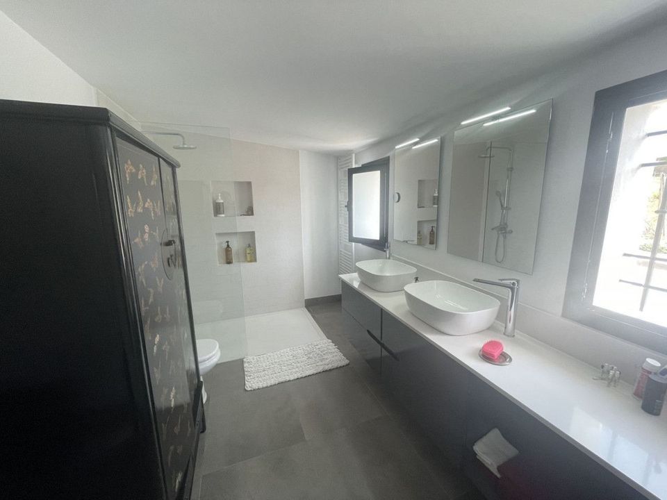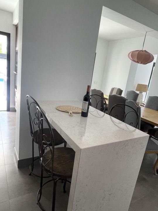 The exterior is simply stunning: a large pool with a shower and sun loungers invites you to relax in the sun. You'll also find a separate covered parking area for two cars, ensuring comfort and security for your vehicle.