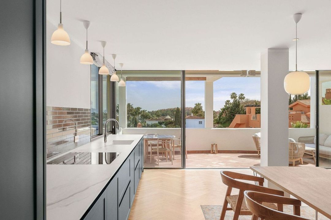 Welcome to this tastefully recently refurbished apartment in Placetes de Belvederes in Nueva Andalucia. As you enter you are greeted with a large open space with light and a feeling of a Loft Style property. All the materials have been carefully selected by the current owner and they have been put together tastefully such as the designer kitchen with Gaggenau appliances and the herring bone wooden floor from Denmark. The position of the property gives you the feel of a penthouse and you can enjoy fantastic sea and mountain views from the good size terrace. There is a good size parking place in the basement, buggy parking and a large storage. Well kept gardens, gym and pool are found in this boutique style development.