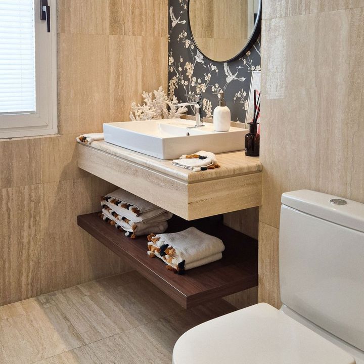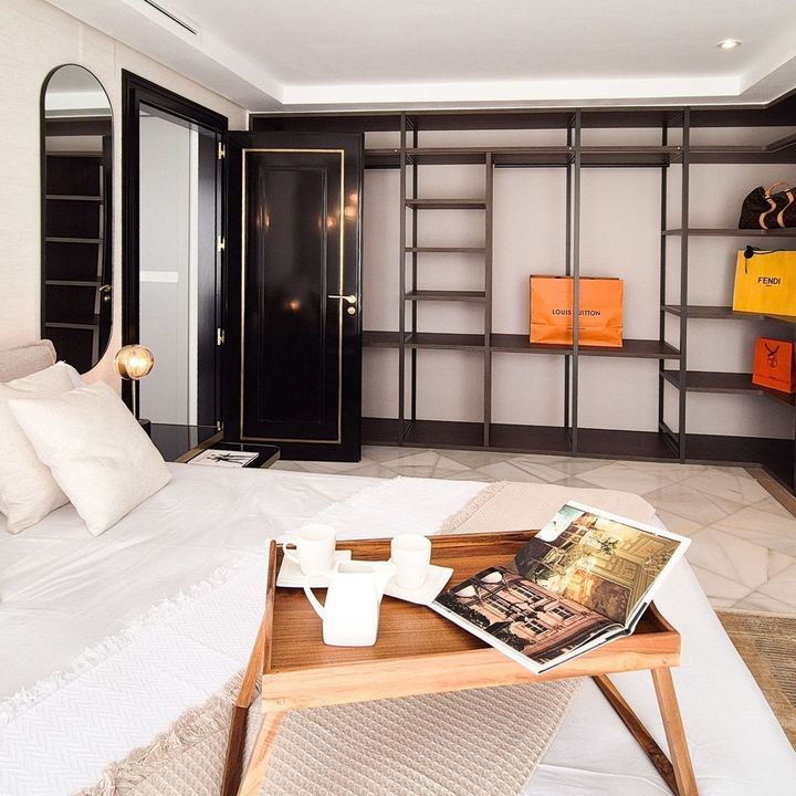 A modern staircase takes us to the second floor, where there is another bedroom, a full bathroom, a wardrobe area, and a large master bedroom with a dressing area and a full bathroom, all with access to the large terrace with views.