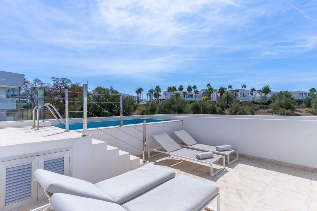 The townhouse also benefits from a large, rooftop terrace complete with a heated plunge pool, big sitting and dining areas and enjoys a beautiful sea view towards the bay of Marbella and Gibraltar. From the pool area, one can enjoy a beautiful sunset every evening.