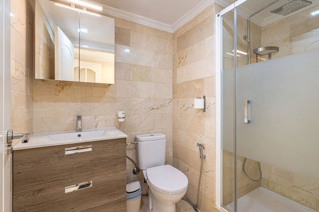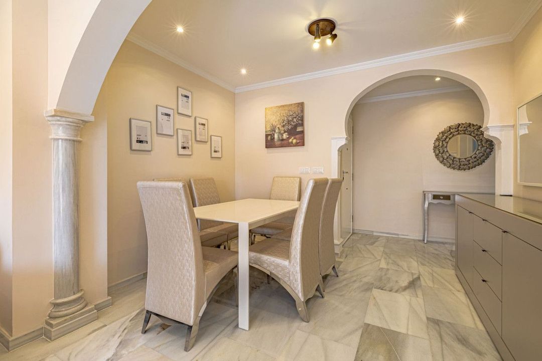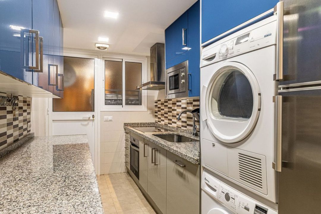 Impeccable corner apartment on the fifth floor with views of the pool and morning sun. The property has been completely renovated and is ready to move into. It has a living-dining room with access to the terrace, a fully equipped kitchen with a laundry room, a master bedroom with an en-suite bathroom and built-in wardrobes, and two further bedrooms, each with its own bathroom. Being on the corner, the property enjoys plenty of natural light. The car park is communal and enclosed with a gate. The building has a communal garden and swimming pool. Located in the heart of the city, just a stone's throw from Marbella's promenade and the beach.