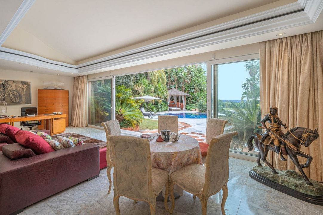 Set on a generous plot, the 640 m² villa is distributed over two levels. The main floor features a welcoming entrance hall leading into a spacious and bright living room with sea views and direct access to the pool area, surrounded by a lush tropical garden. This level also includes a dining room, a fully equipped kitchen, and four generously sized bedrooms, each with its own en-suite bathroom.