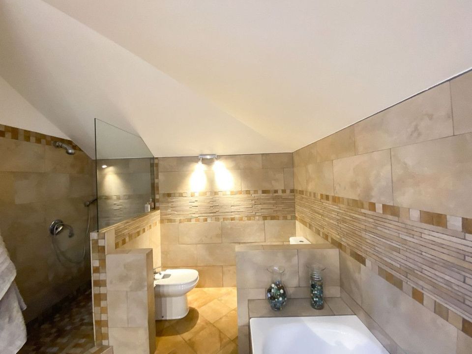 The garden offers privacy mature vegetation and a large swimming pool surrounded by anti thermal terrace plus seating areas with awnings night lighting fruit trees and space for urban or vertical vegetable garden ideal for both relaxing and hosting guests The interior is bright and elegant with two spacious living rooms one with fireplace high ceilings marble floors and large windows