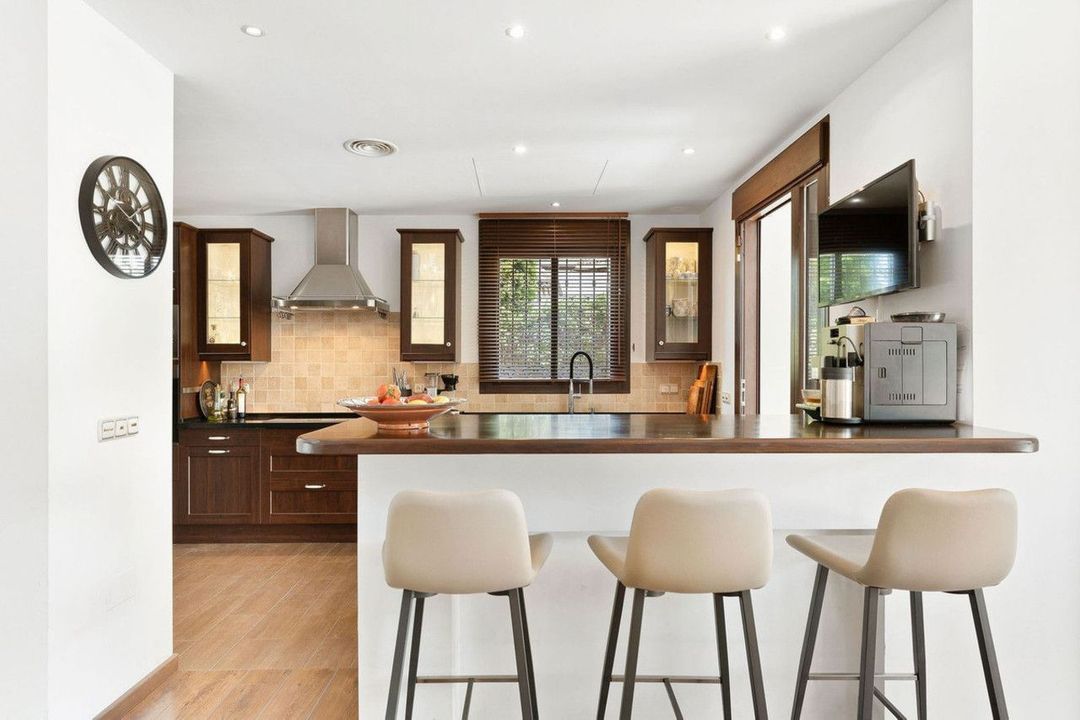 Outside, a private swimming pool is surrounded by lush greenery, sun loungers, and shaded areas — perfect for long, lazy afternoons or evening BBQs under the stars. The garden is low-maintenance yet full of charm, offering a peaceful oasis just minutes from the vibrant heart of San Pedro.