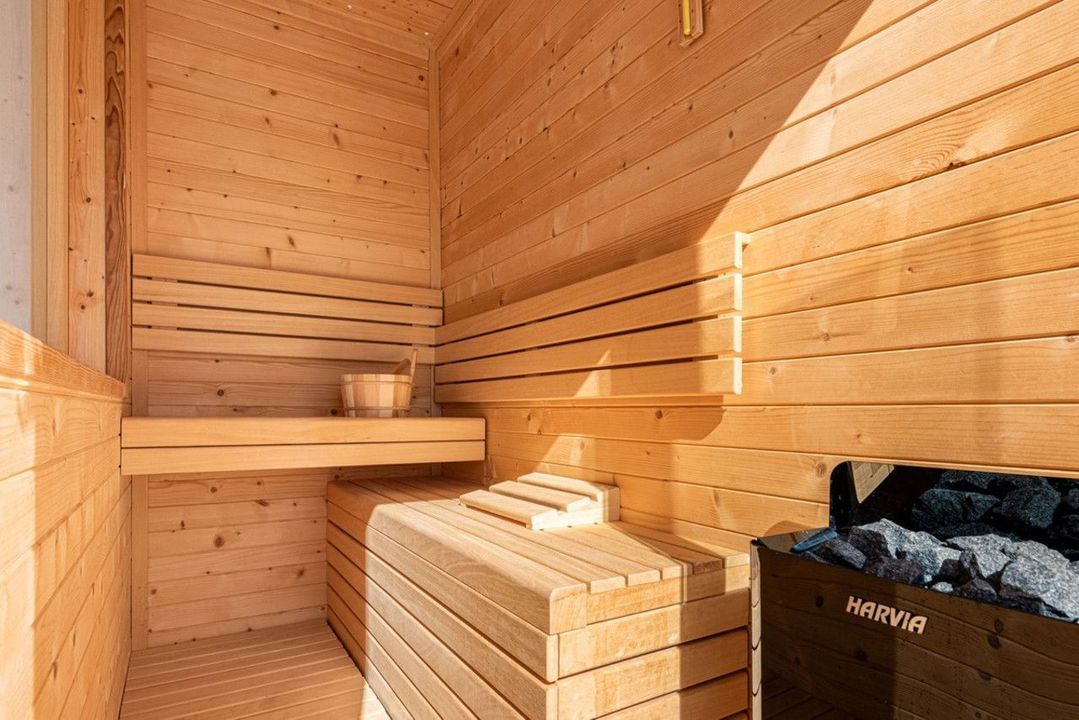 On the ground floor, a bright open-plan layout welcomes you with a stylish living area seamlessly connected to a modern Miele-equipped kitchen. Large sliding doors open onto a spacious terrace featuring an outdoor kitchen and a comfortable lounge area—ideal for relaxing or entertaining. This level also includes a guest bedroom and a full bathroom.