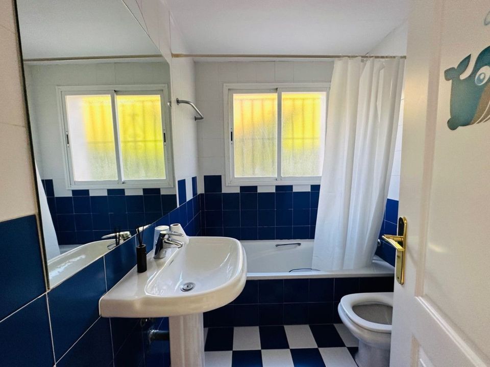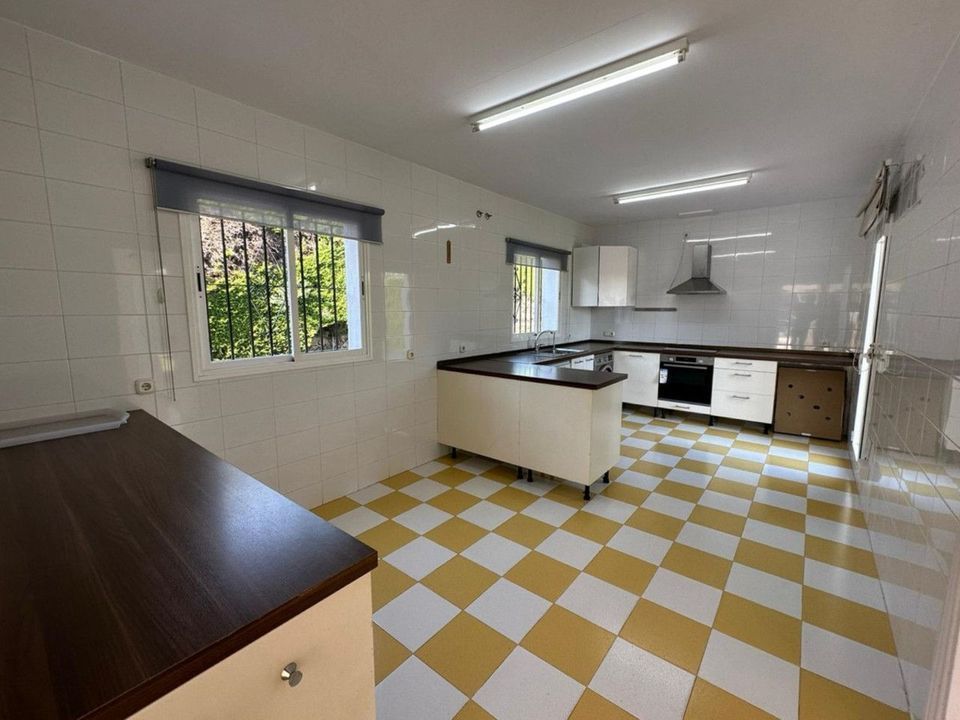 Spread over two levels, the ground floor of the villa features a spacious living and dining room, complete with a working fireplace, creating a warm and inviting atmosphere. From here, you can access the covered terrace and beautifully private garden, perfect for enjoying the Mediterranean climate.