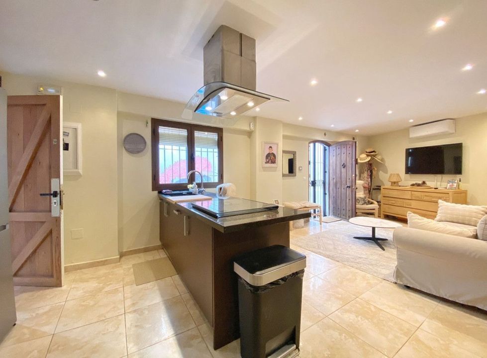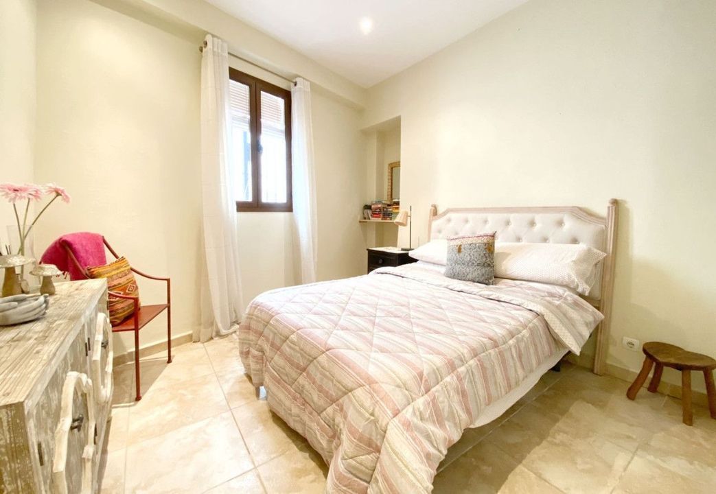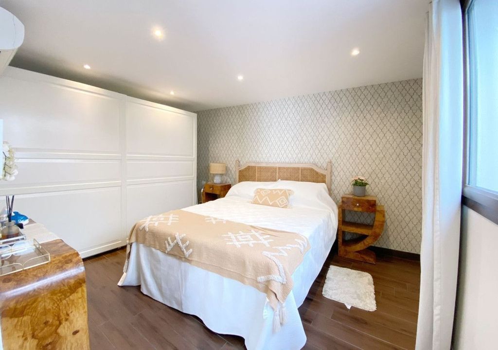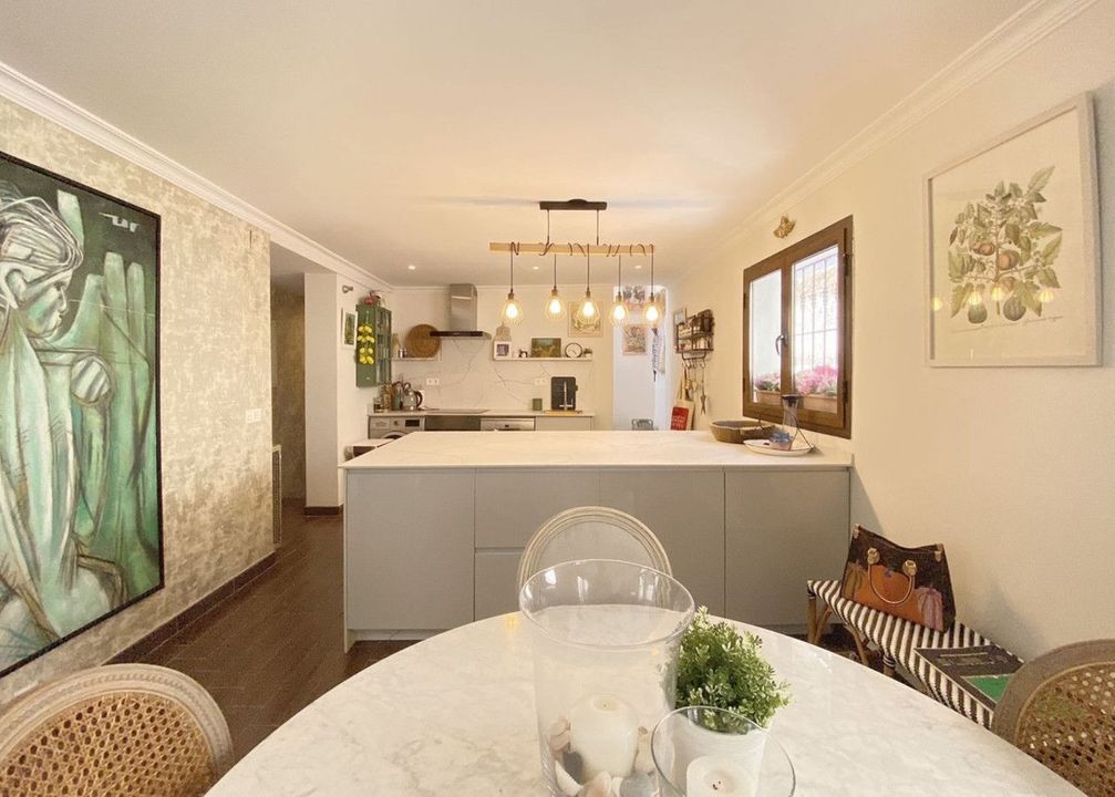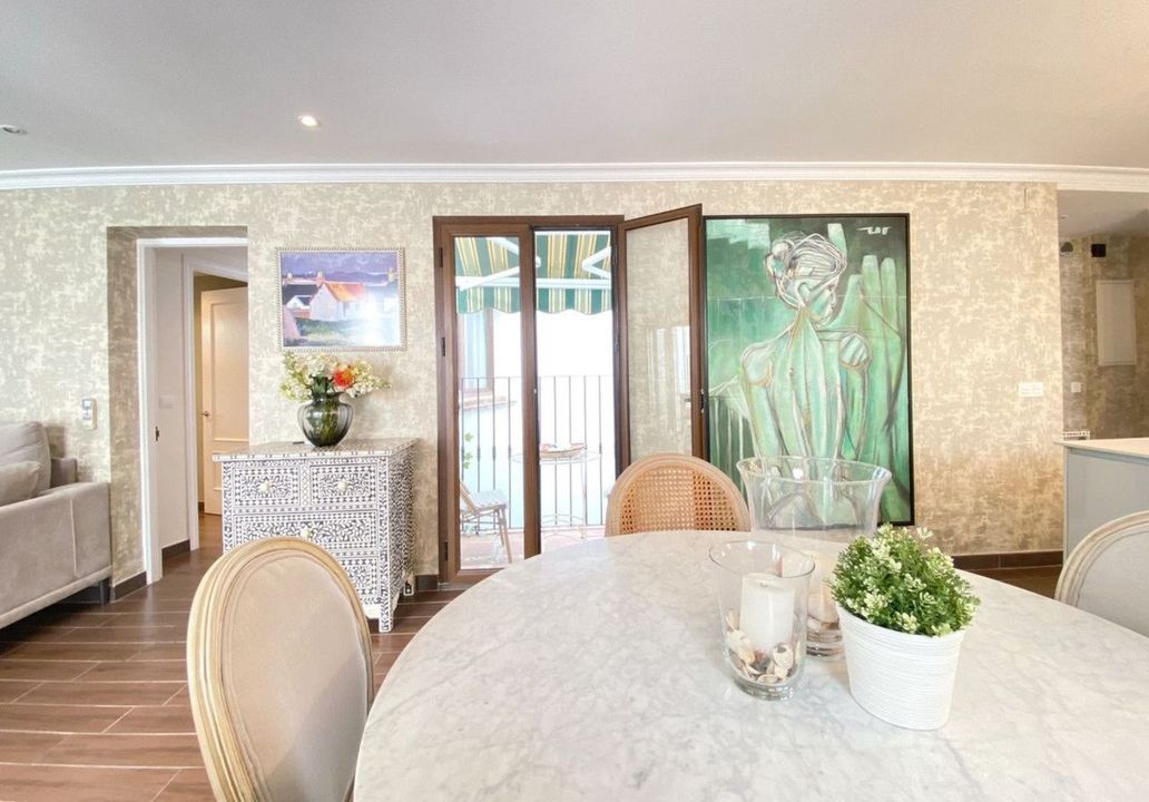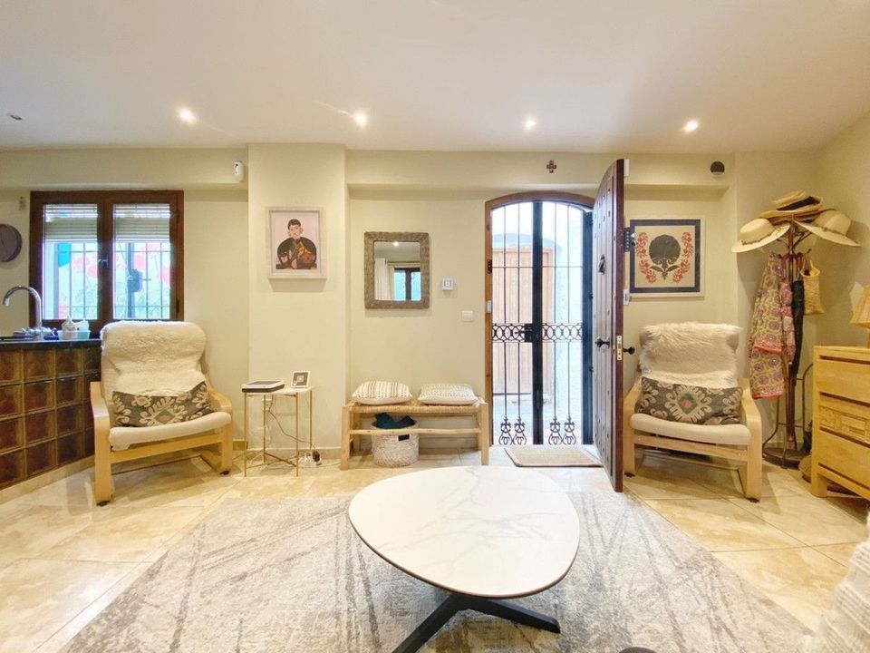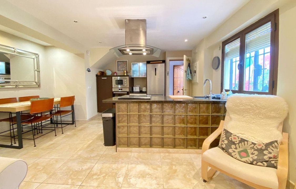 On the upper floor, there is an impressive living-dining room with balconies overlooking the street and another small balcony overlooking the house's interior courtyard. A modern kitchen with a central island. And two double bedrooms, both with en-suite bathrooms.