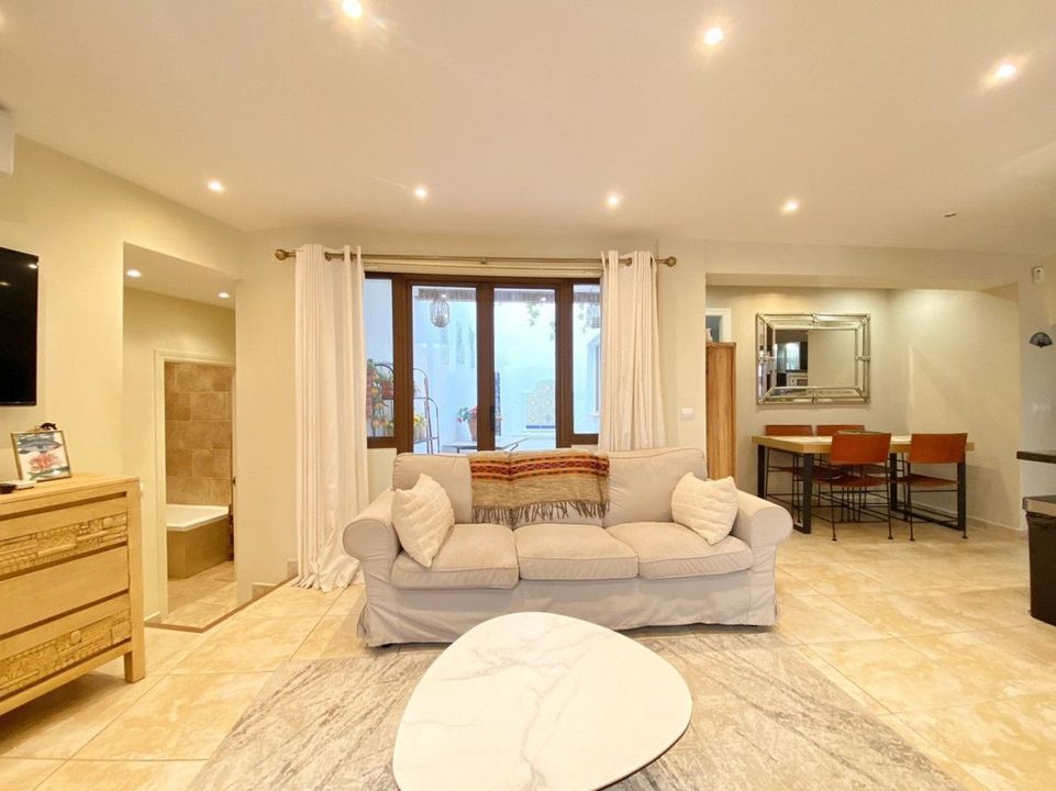 On the main floor, there is a cozy living and dining room, a kitchen with an island, and a beautiful central interior courtyard. There are also 3 spacious bedrooms and 2 bathrooms. The master bedroom has an en-suite bathroom.