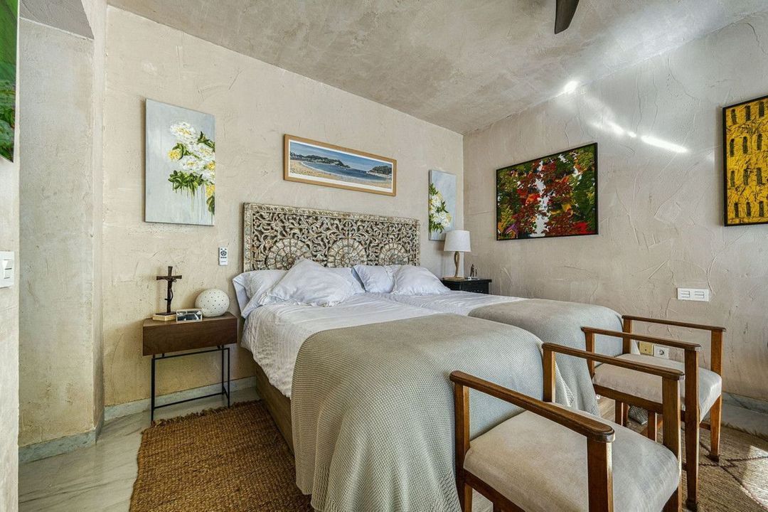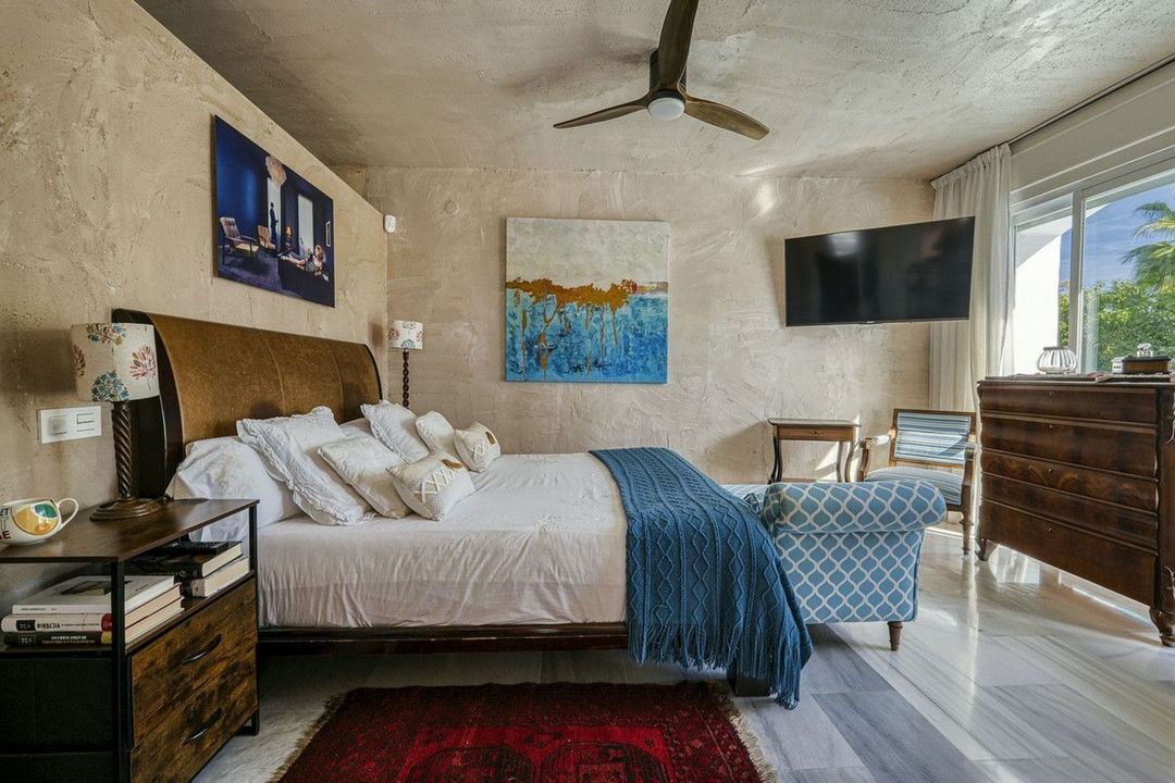 Experience the essence of tropical tranquility in this exquisite penthouse duplex in Guadalmina Baja, set amidst lush landscaped gardens and soothing water features. Meandering pathways wind through vibrant palms and exotic blooms, leading to a gentle stream filled with koi fish and lily pads, infusing the air with calm and natural harmony. Designed by a renowned landscape architect, the gardens open out to a turquoise lagoon with inviting sunbathing areas and a pool bar, perfect for relaxing with family, enjoying a refreshing drink or simply unwinding in nature's embrace.