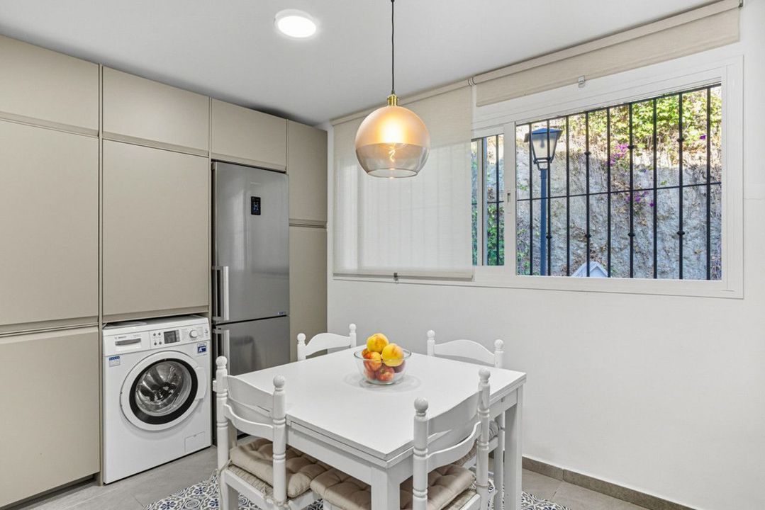 Dit mooie drie-slaapkamer, op het zuiden gerichte herenhuis is gelegen in de gewilde gated community van El Capricho op Marbella.Het biedt ruime tropische tuinen en twee gemeenschappelijke zwembaden. Ideaal gelegen op loopafstand van het strand, bars en restaurants, en op slechts een korte rit van Marbella Center en Puerto Banús, het pand combineert gemak met charme. De begane grond beschikt over een lichte woon- en eethoek met een open haard en toegang tot een royaal terras perfect voor buiten eten, een onlangs gerenoveerde aparte keuken en een gastentoilet. De trap leidt naar een grote kelder die momenteel wordt gebruikt als slaapkamer en kunststudio met een eigen badkamer. Boven wordt de master suite begeleid door twee gastenkamers en een familiebadkamer. Extra hoogtepunten zijn onder andere inbouwkasten, marmeren vloeren, en een eigen parkeerplaats voor een auto.