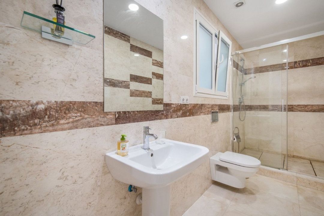 Het pand beslaat drie verdiepingen. De begane grond beschikt over een ruime hal, een woonkamer met directe toegang tot het terras en de tuin, een goed uitgeruste keuken, een eetkamer, een lichte slaapkamer met een eigen badkamer en een gastentoilet. De bovenste verdieping bestaat uit de master suite en een gasten suite, beide met toegang tot een groot terras met gedeeltelijk uitzicht op zee. Het lagere niveau omvat twee extra slaapkamers die een badkamer delen, een wasruimte, een grote multifunctionele kamer en directe toegang tot de garage.
