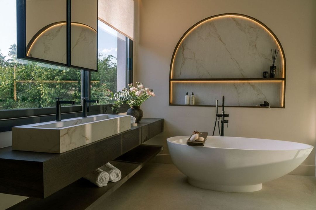 Binnen vindt u een harmonieuze combinatie van natuurlijke materialen en rustgevende kleuren, die een uitnodigende sfeer creëren en tot volledige ontspanning uitnodigen. De ruime indeling beschikt over vijf prachtig ontworpen slaapkamers en zes moderne badkamers, waardoor deze villa perfect is voor gezinnen en liefhebbers van gastvrijheid.