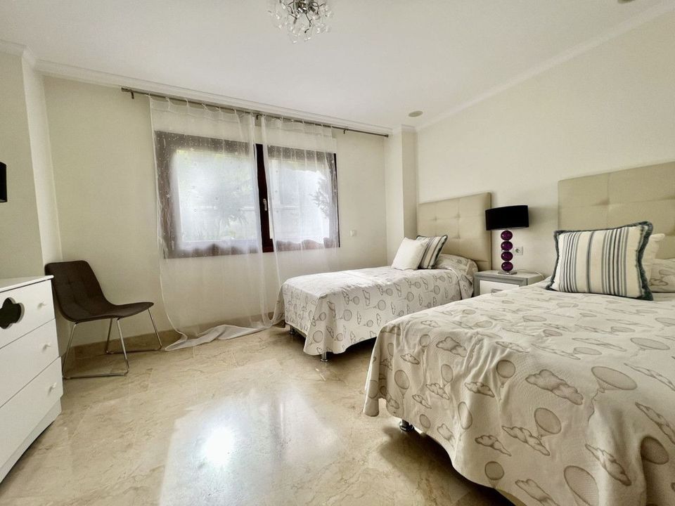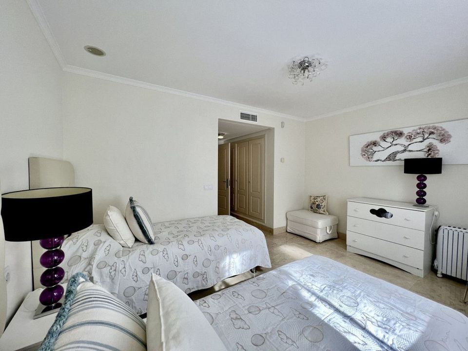2 bed ground floor apartment in the exclusive, gated community of Lomas del Rey, exceptional high-quality construction melded with extraordinary attention to detail yield this contemporary apartment. Its expansive spaces, open concept floorplan and walls of glass create a breathtaking experience of spaciousness and light. On entering the home through the hallway, to the right, there is a large living/dining room and kitchen which open onto the expansive terrace. Straight ahead there is a corridor with guest toilet and guest suite with a walk-in closet. To the left is the sizeable master suite, also with walk-in closet and a private terrace.
