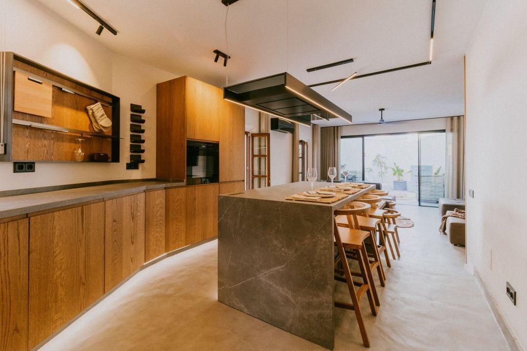 The open-plan living and dining area is bathed in natural light, providing a luxurious yet comfortable space with a real wood fireplace, perfect for relaxing or entertaining. Expansive glass doors lead to a private Andalusian-style patio, offering a serene retreat for outdoor relaxation.