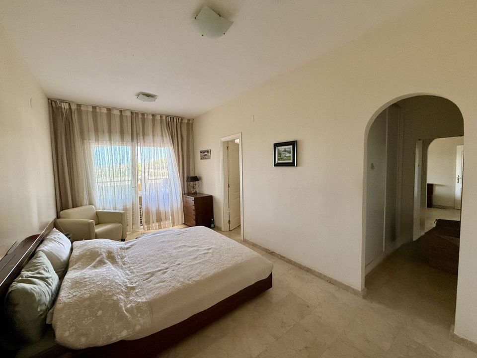 The apartment is west-facing and in excellent condition, featuring a spacious living area with marble flooring, a fully fitted kitchen, and a private terrace where you can take in panoramic views of the sea and mountains. Additional features include air conditioning (hot and cold), double glazing, fitted wardrobes, lift access, storage room, utility room, and an en-suite bathroom.