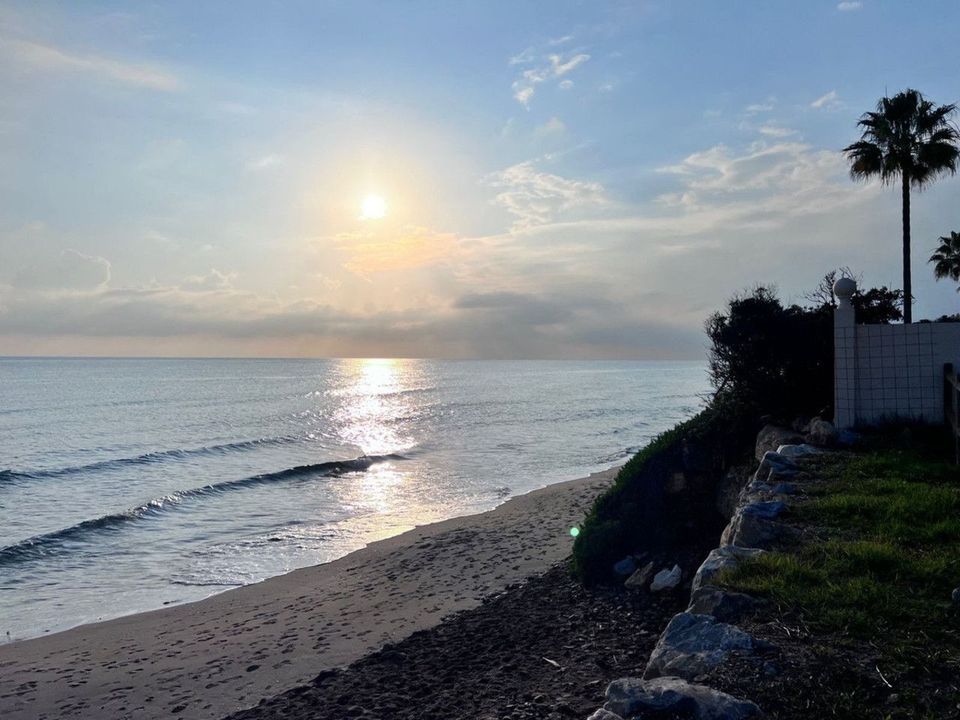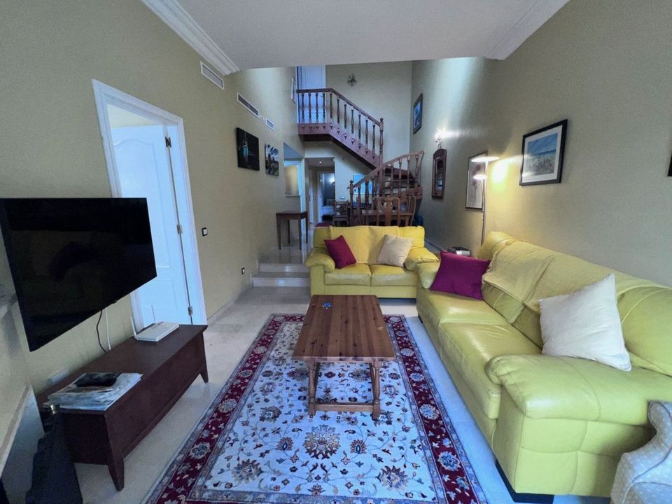 Welcome to this extremely spacious beach-side duplex penthouse, located in the ever popular Carib Playa, "Fairways" close to Cabopino & Elviria. On the main level this stunning apartment offers, 2 double bedrooms, one at each end of the apartment, the master bedroom has its own en-suite bathroom plus there is an additional full shower room servicing the second bedroom, a brand new fully fitted kitchen including new appliances, Oven, dishwasher, microwave etc. Off the kitchen there is a separate utility room housing the washing machine, tumble dryer & storage, then a split level lounge/dining area with its double height ceiling leading to the south facing double terrace with partial awning that spreads across both the lounge & master bedroom, This terrace offers lovely views of the communal gardens & pool area. back inside a wooden stair case leads up to the top floor offering yet another double bedroom with full bath & shower en-suite with a velux sky light, this bedroom also has access to its own private south facing terrace.