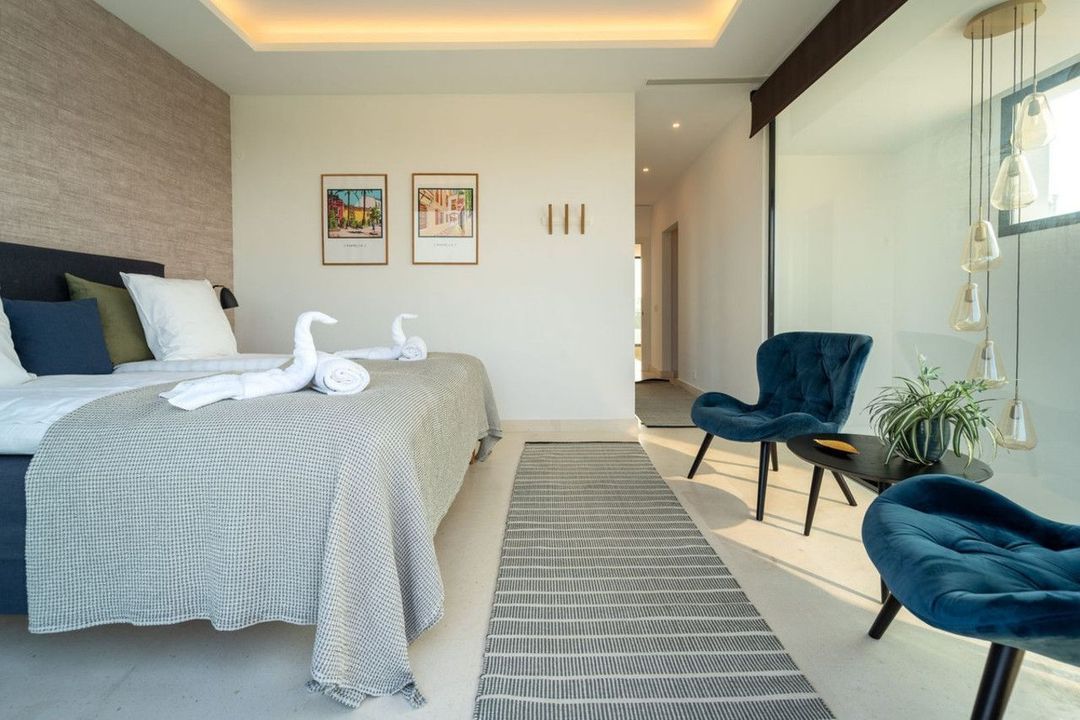 This luxury semi-detached villa offers five double bedrooms and is finished to a high standard with stunning views to the sea, golf course and the Marbella mountains.