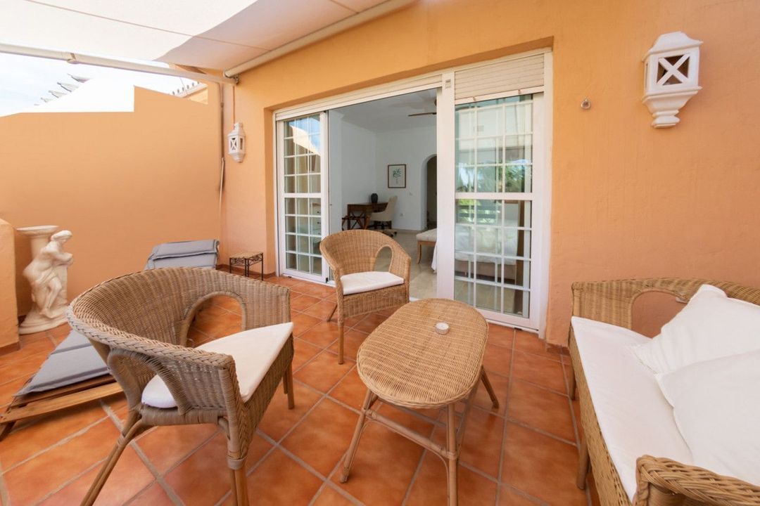 Ground floor: guest toilet, a bright living room with fireplace, fully fitted kitchen, and access to a charming private patio with a small pool, leading directly to the lush tropical communal garden with a large shared swimming pool.