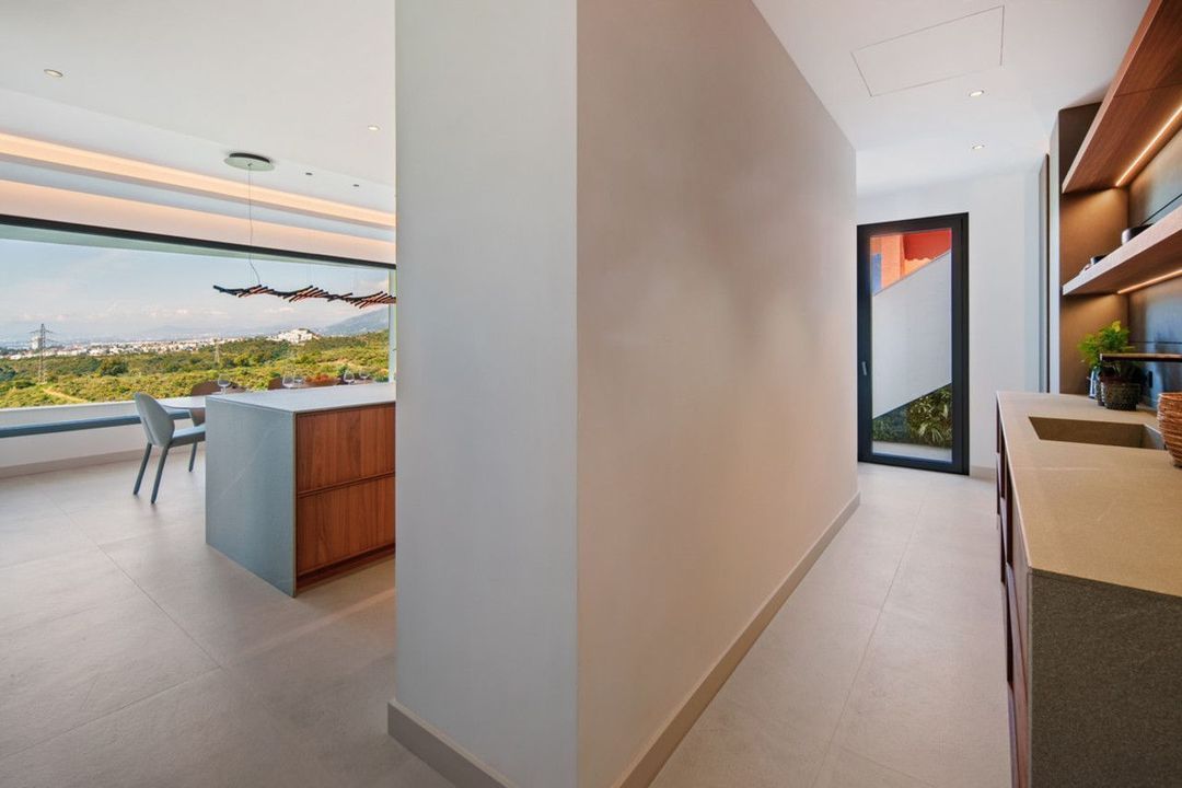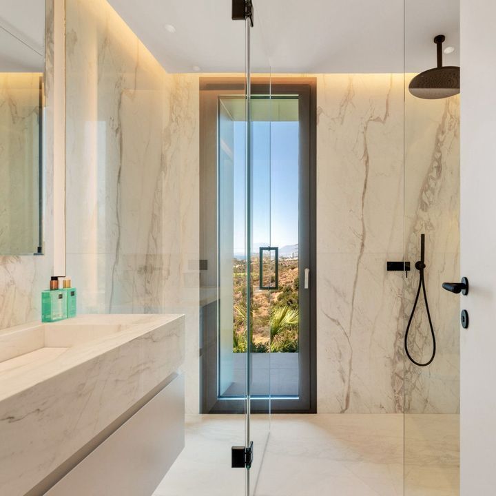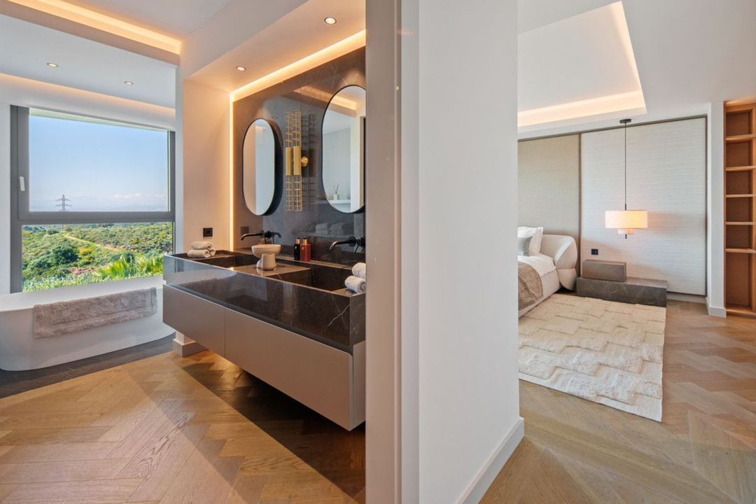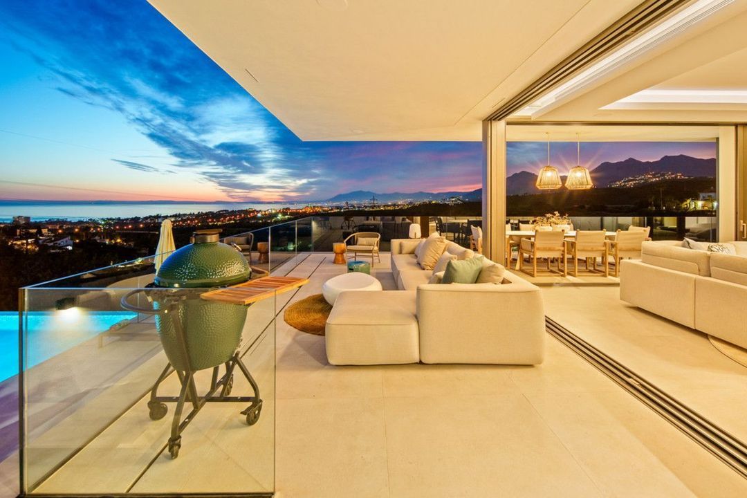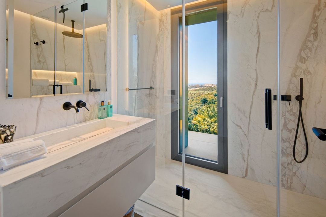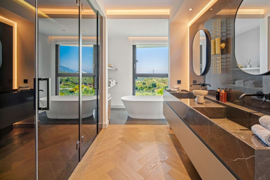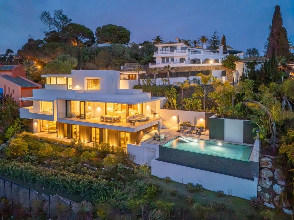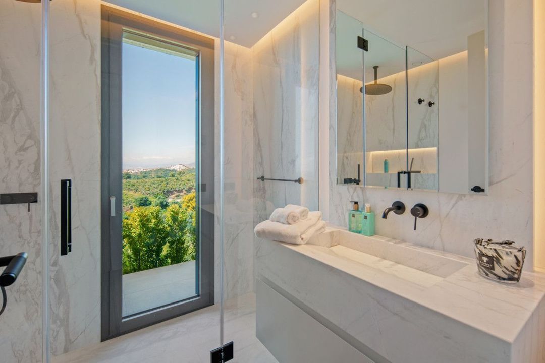 Inside, the villa is finished to a high standard with elegant stone surfaces, warm wood cabinetry and discreet lighting. Generous bedrooms include stunning ensuite bathrooms, while the master suite offers direct terrace access and panoramic sea views. With its modern design, private setting and exceptional vistas, El Rosario 430 is a standout contemporary home in Marbella East.