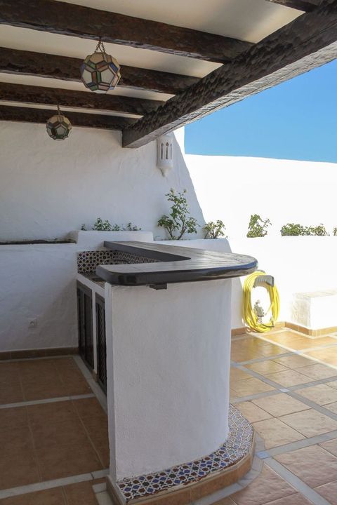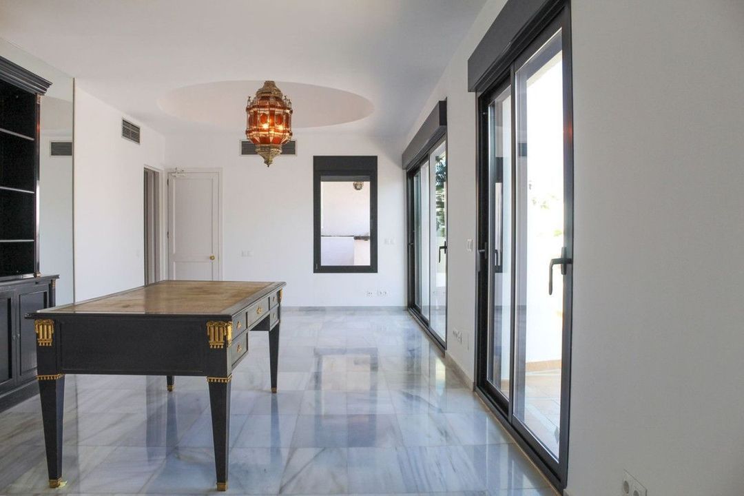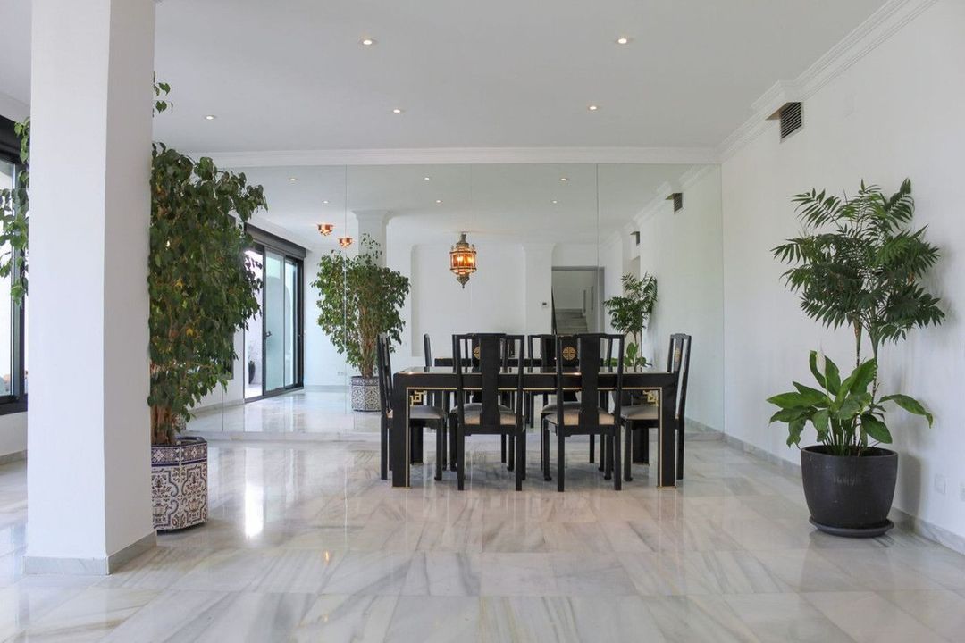 Very exclusive duplex penthouse, South facing, consisting in 3 bedrooms, 2 bathrooms, fully fitted kitchen and large lounge and dining area with access to a very nice terrace overlooking the fantastic gardens and pool area of the complex. On the upper floor we find an enormous master bedroom with en suit bathroom, large walking wardrobe and office. We also find another very large terrace with bar. garage and storeroom are included.