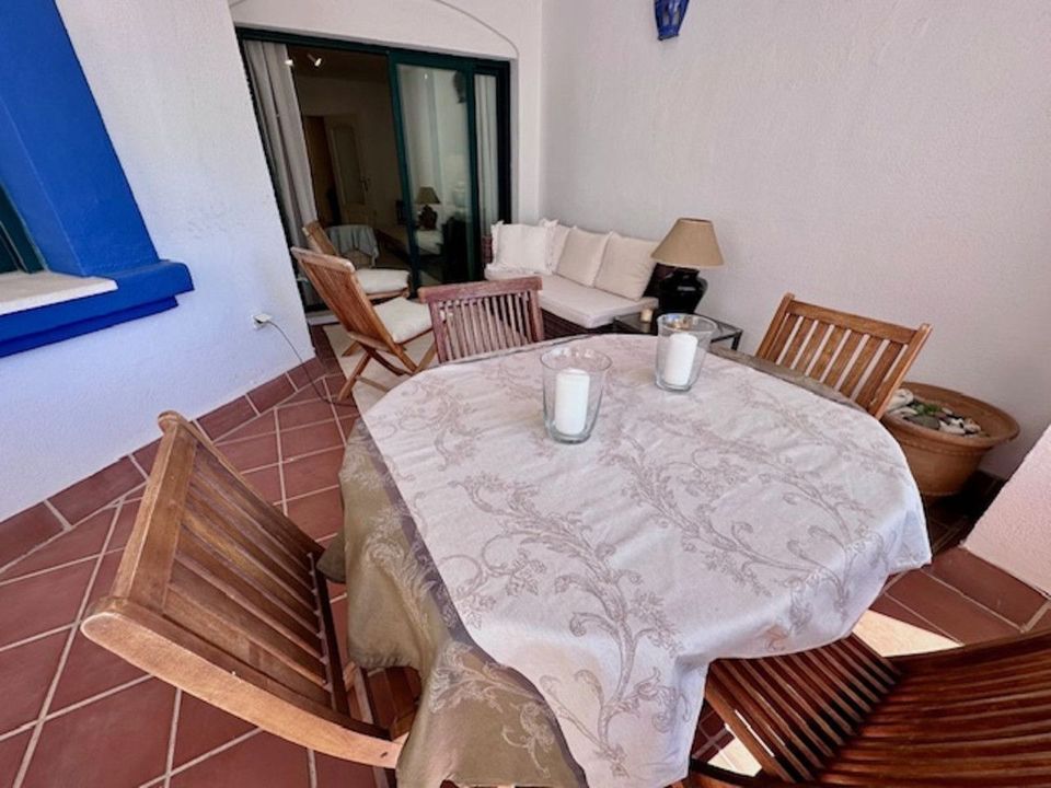In the hallway, we find a guest bathroom and enter the spacious living-dining room with access to a large terrace (approximately 25 m2) with direct views of the pool and the sea!