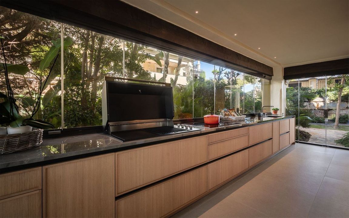 Designed across a single level for utmost comfort, the residence boasts a sophisticated layout. The custom wood-panelled entrance hall opens to a fully equipped open-plan Miele kitchen with an elegant breakfast bar, flowing seamlessly into a spacious living and dining area connected to a wraparound covered terrace and private garden with its own swimming pool. The property also benefits from a second Chef´s kitchen featuring top-of-the-line equipment and fully enclosed with glass curtains that can be opened up completely during the warm summer days, converting it to your own fully functional outdoor kitchen.