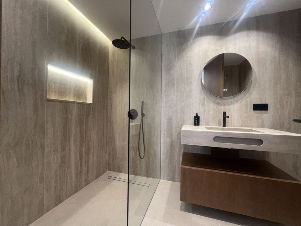 Upon entering, you are welcomed by an elegant hallway, a guest toilet, and a corridor that opens into a bright and spacious living and dining area. The sleek contemporary kitchen, partially integrated and framed by sophisticated glass doors, creates a stylish and harmonious flow throughout the space.