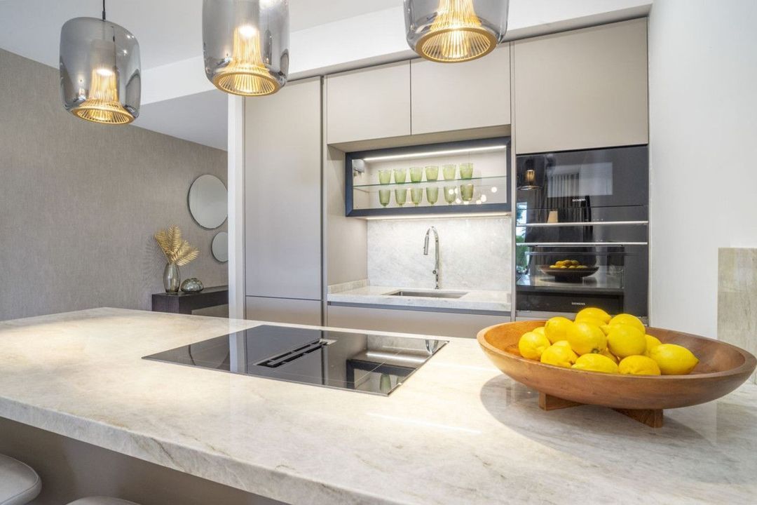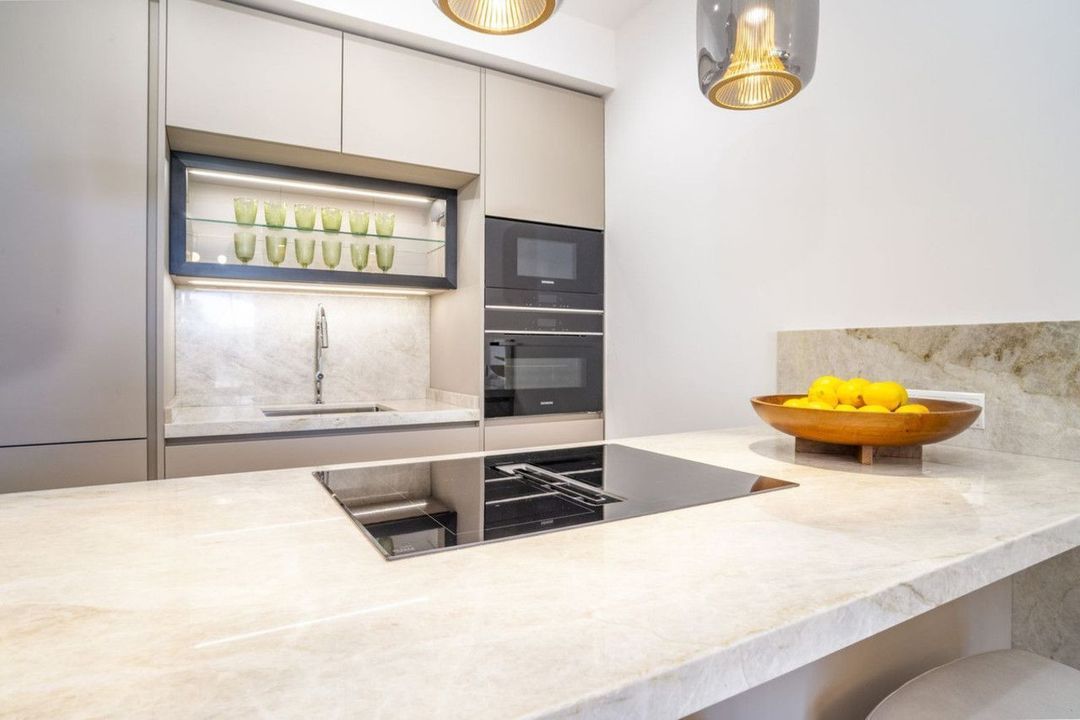 The interior is equally impressive, with ceramic flooring throughout and large fitted wardrobes offering ample storage space. The kitchen features elegant marble worktops paired with high-end Siemens appliances, including a washing machine and dryer. Electric shutters in all rooms provide added comfort and security.