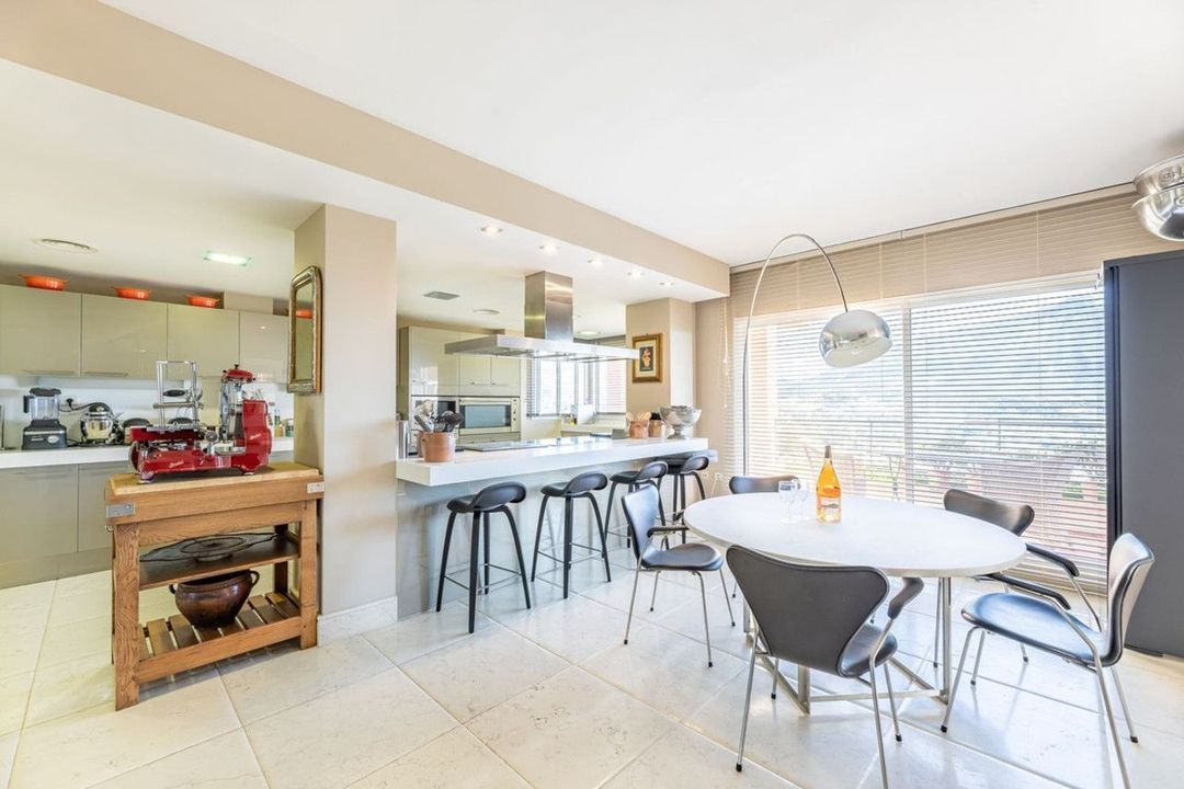 Met bijna 1200m2 heeft deze geweldige woning 5 slaapkamers met 5 badkamers en suite, een gastentoilet, een woonkamer met dubbelhoge plafonds, een aparte eetkamer, een keuken met twee dubbele koelkasten, twee ovens, twee vaatwassers, een enorm solarium met een verwarmd privézwembad op het dak en 360° uitzicht op de zee, de bergen en de golfbaan.