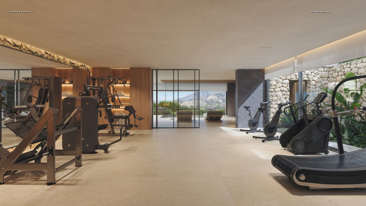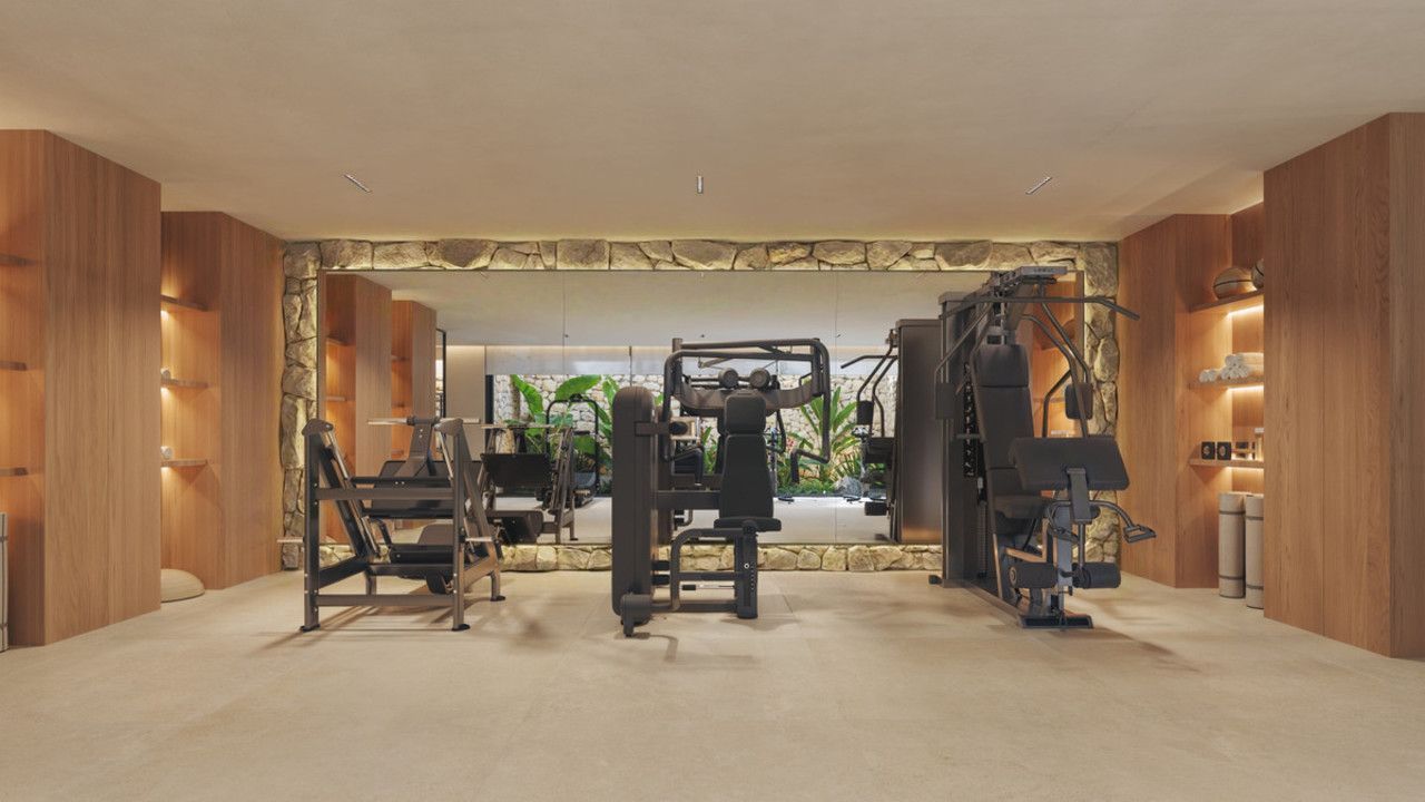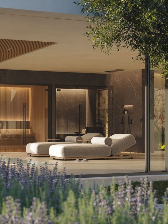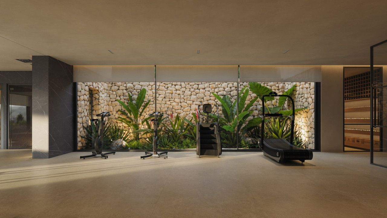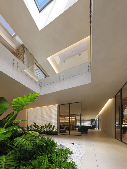 5 slaapkamers met eigen badkamers en aparte garderobes op elk verdieping. Spa en fitnessruimte, bioscoop en ontspanningsruimte. Hoge plafonds, grote ramen en een binnentuin creëren een gevoel van ruimte en licht door het hele huis.