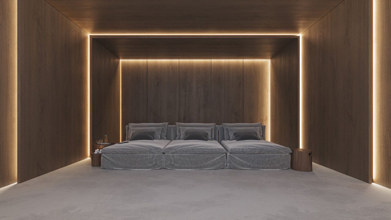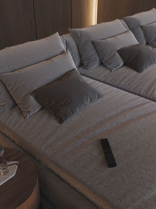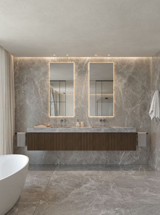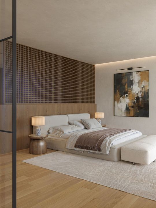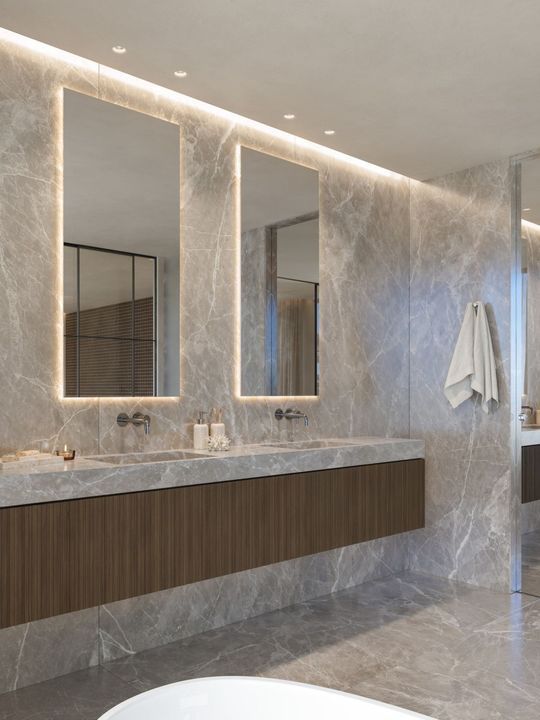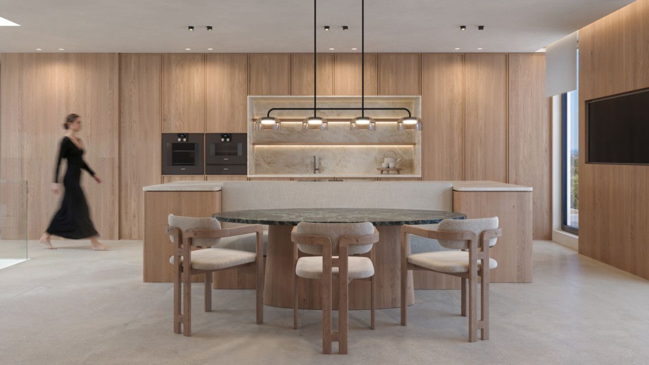 5 slaapkamers met eigen badkamers en aparte garderobes op elk verdieping. Spa en fitnessruimte, bioscoop en ontspanningsruimte. Hoge plafonds, grote ramen en een binnentuin creëren een gevoel van ruimte en licht door het hele huis.
