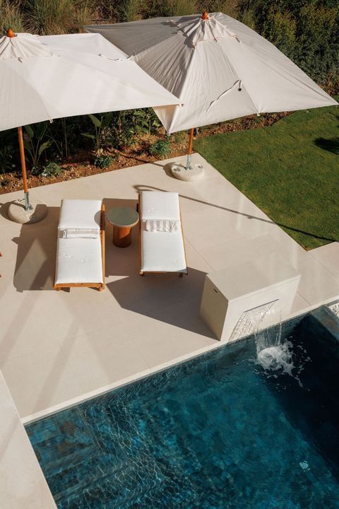 De benedenverdieping biedt 3 slaapkamers, 2 badkamers en 1 gastentoilet, een ruime woonkamer met geïntegreerde eetkamer en een volledig uitgeruste keuken met werkblad, verlichting, meubels en apparaten van topmerken en actueel design: koelkast, oven, magnetron, vaatwasser, geïntegreerde wasmachine/droger, gootsteen, kranen, inductiekookplaat en afzuigkap van het merk GAGGENAU of vergelijkbaar. De woonkamer heeft directe toegang tot de privé tuin en het zwembad met een groot barbecuegebied.